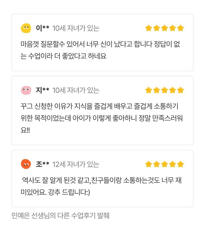반가워요 친구들~ 친구들과 함께 재밌게 역사이야기를 나눠볼 동글샘 민예은이예요. 선생님은 역사가 너무 재밌고 좋아서 국사학과를 갔어요. 또 선생님의 자녀들을 위해 시작한 하브루타가 우리 친구들과 즐겁게 공부하는 데 너무 좋은 역할을 한다는 것도 알게 되어 하브루타로 친구들과 그림책 공부, 역사 공부 등을 진행하고 있어요. 선생님이 느꼈던 역사에 대한 재미를 친구들에게도 나눠주고 싶어요. 역사와 하브루타의 결합을 통해 우리 친구들과 어렵고 지루하지 않은 흥미진진한 역사시간을 가져보아요.