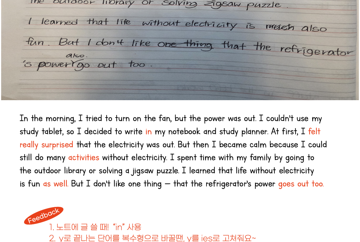 영어로 타이핑 치는게 어렵고 어색한 학생들을 위한 클래스라, 노트에 직접 적어 발표하는 형식으로 진행이 됩니다.