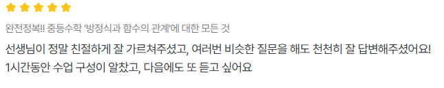 고려대(서울 캠퍼스) 졸업 강남3구 유명학원 학원장으로 15여 년간 근무 초중고등 학원용 교재 십수여 권 직접 제작 2016학년도 수능 입시에서 수능 만점자를 고1부터 지도함. 서울 소재 강남 3구에서 15년간 중등 의대, 최고반 및 고등 1등급반, 수능 1등급반을 지도하였습니다. 학원 원장으로 10년 동안 다양한 수준의 학생을 지도하면서 다양한 경험을 하였습니다. 특히 선생님은 학생의 생각을 읽고, 어떤 습관을 가지고 있는지 빨리 파악하여 그에 맞는 대응책과 방법을 제시하는 장점이 있습니다. 선생님의 다양한 수업 경험과 학생 관찰으로 수많은 학생이 수학에 자신감을 가지게 되었고 성적이 향상 되었습니다. 수학은, 복잡한 생각을 정리해주고 문제 해결의 도움이 되는 학문입니다. 즉, 실제로 우리에게 꼭 필요한 과목입니다. 그러나 요즘 학생들은 수학 개념과 이론을 (비판도 없이) 암기하고 (왜 그렇게 푸는지 모르는 채) 문제를 유형별로 반복적으로 풀어야 하는 과목이 수학이라고 생각합니다. 수학은 연산을 기초로 하여 학년이 올라갈수록 새로운 개념과 이론을 이미 배운 것과 연결하고 확장하여 학습해야 하지만, (수학이 연산이라는 생각이 강한) 학생은 '수학은 연산'이라는 생각으로 수학을 바라보니 한계가 생깁니다. 그래서 연산 실력이 좋을수록 중학 수학이 더 어렵게 느껴집니다. 이런 어려움은 고등 수학을 배울 때 또 경험하게 됩니다. 수학 개념과 이론은 학생이 주도적으로 이해하려는 습관이 필요한 부분이고 문제 해결은 문제 분석과 해결 전략이 필요한 부분입니다. "수학 개념의 연결과 확장" 그리고 "문제 분석 및 이해 그리고 문제해결전략"을 배워야 시간이 흐를수록 수학은 간단하고 쉽다는 것을 느낄 수 있을 것입니다. 선생님은 이것을 학생이 깨닫도록 도와줄 것입니다. 선생님의 수업 방식은 다소 특별합니다. 1. 개념과 이론이 '왜' 필요한지, '어떻게' 해서 이렇게 표현되었는지, 이미 배운 개념 중 "무엇"과 연결되는지 설명합니다. 2. 학생이 스스로 자기 생각을 말할 기회를 줍니다. 그래서 잘 된 생각과 수정해야 할 생각을 구분하여 줍니다. 3. 학생이 문제를 '어떻게' 풀었는지 학생의 생각을 이해합니다. 4. 문제를 분석하는 법, 이해하는 법, 해결의 시작점을 알려줍니다. 5. 문제를 유형화시켜 수업하지 않습니다. 그래서 풀이법도 유형화시켜 가르치지 않습니다. 6. 학생이 올바르게 (논리적으로) 풀었는지 수시로 확인하고, 학생의 생각을 말로 표현하도록 합니다(말로 표현하면 스스로 약점을 알게 됩니다).