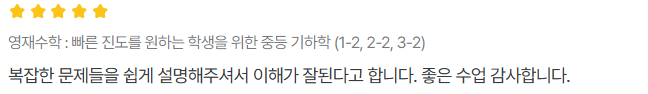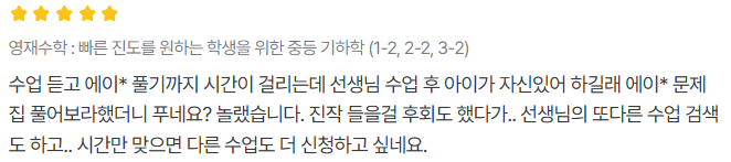 고려대(서울 캠퍼스) 졸업 강남3구 유명학원 학원장으로 15여 년간 근무 초중고등 학원용 교재 십수여 권 직접 제작 2016학년도 수능 입시에서 수능 만점자를 고1부터 지도함. 서울 소재 강남 3구에서 15년간 중등 의대, 최고반 및 고등 1등급반, 수능 1등급반을 지도하였습니다. 학원 원장으로 10년 동안 다양한 수준의 학생을 지도하면서 다양한 경험을 하였습니다. 특히 선생님은 학생의 생각을 읽고, 어떤 습관을 가지고 있는지 빨리 파악하여 그에 맞는 대응책과 방법을 제시하는 장점이 있습니다. 선생님의 다양한 수업 경험과 학생 관찰으로 수많은 학생이 수학에 자신감을 가지게 되었고 성적이 향상 되었습니다. 수학은, 복잡한 생각을 정리해주고 문제 해결의 도움이 되는 학문입니다. 즉, 실제로 우리에게 꼭 필요한 과목입니다. 그러나 요즘 학생들은 수학 개념과 이론을 (비판도 없이) 암기하고 (왜 그렇게 푸는지 모르는 채) 문제를 유형별로 반복적으로 풀어야 하는 과목이 수학이라고 생각합니다. 수학은 연산을 기초로 하여 학년이 올라갈수록 새로운 개념과 이론을 이미 배운 것과 연결하고 확장하여 학습해야 하지만, (수학이 연산이라는 생각이 강한) 학생은 '수학은 연산'이라는 생각으로 수학을 바라보니 한계가 생깁니다. 그래서 연산 실력이 좋을수록 중학 수학이 더 어렵게 느껴집니다. 이런 어려움은 고등 수학을 배울 때 또 경험하게 됩니다. 수학 개념과 이론은 학생이 주도적으로 이해하려는 습관이 필요한 부분이고 문제 해결은 문제 분석과 해결 전략이 필요한 부분입니다. "수학 개념의 연결과 확장" 그리고 "문제 분석 및 이해 그리고 문제해결전략"을 배워야 시간이 흐를수록 수학은 간단하고 쉽다는 것을 느낄 수 있을 것입니다. 선생님은 이것을 학생이 깨닫도록 도와줄 것입니다. 선생님의 수업 방식은 다소 특별합니다. 1. 개념과 이론이 '왜' 필요한지, '어떻게' 해서 이렇게 표현되었는지, 이미 배운 개념 중 "무엇"과 연결되는지 설명합니다. 2. 학생이 스스로 자기 생각을 말할 기회를 줍니다. 그래서 잘 된 생각과 수정해야 할 생각을 구분하여 줍니다. 3. 학생이 문제를 '어떻게' 풀었는지 학생의 생각을 이해합니다. 4. 문제를 분석하는 법, 이해하는 법, 해결의 시작점을 알려줍니다. 5. 문제를 유형화시켜 수업하지 않습니다. 그래서 풀이법도 유형화시켜 가르치지 않습니다. 6. 학생이 올바르게 (논리적으로) 풀었는지 수시로 확인하고, 학생의 생각을 말로 표현하도록 합니다(말로 표현하면 스스로 약점을 알게 됩니다).