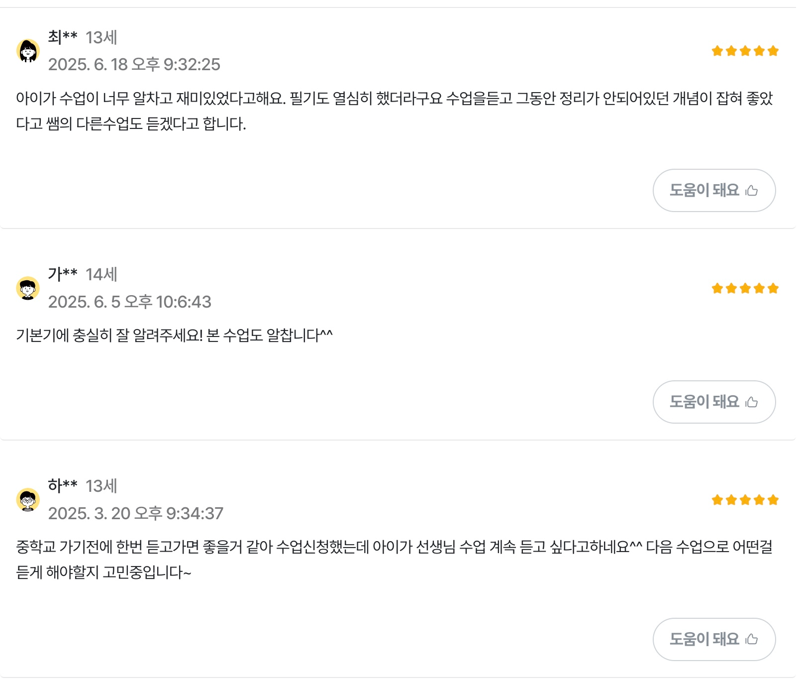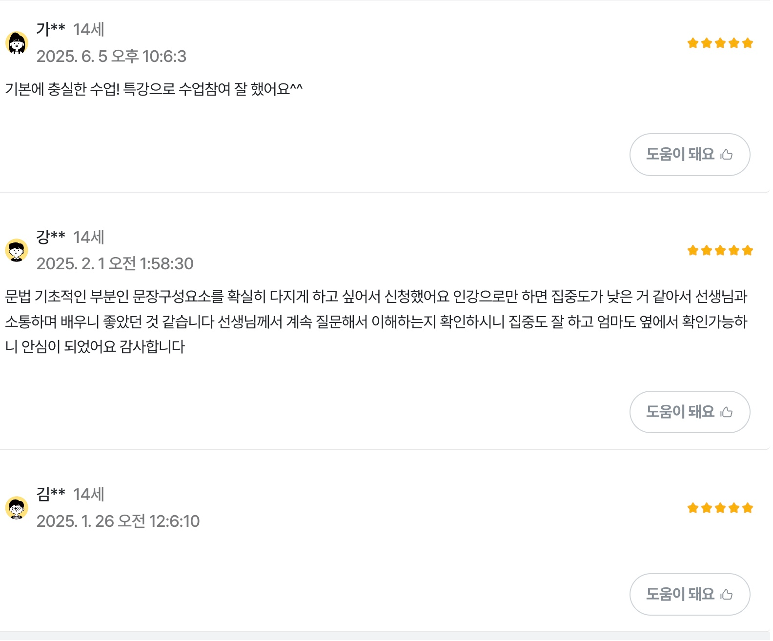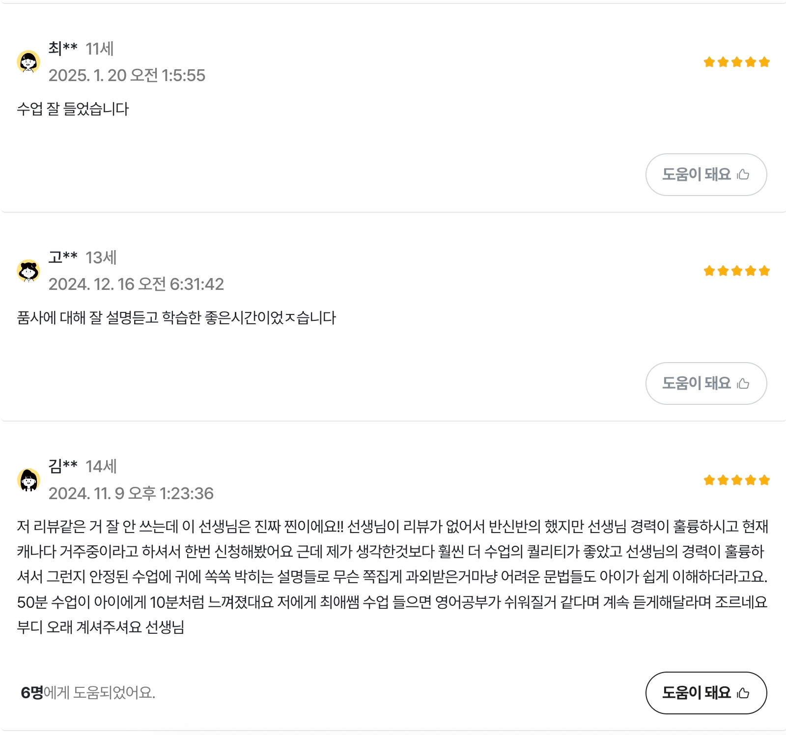 안녕하세요. 최애쌤(최예린 선생님) 입니다. - 15년이상 대형어학원 및 입시영어학원 강사 및 원장 - 초등/중등/고등/수능 입시영어 및 수능내신영어 강사 - TEPS 영문법 강사 - EBS 수능특강 내신문제집 '1시10분' 감수 및 검토자 활동 - 중고등 어휘보카책 '다보카' 감수 및 검토자 활동 - 자체교재개발 및 연구활동 -아이엘츠,듀오링고,토플 시험대비 현재 저는 캐나다에 거주하고 있으며 캐나다에서도 꾸준히 한국 초중고 학생들 대상으로 입시영어 뿐만 아니라 아이엘츠, 듀오링고, 토플영어를 가르치고 있습니다. - 어휘 / 유의어반의어 - 초중등영문법 / 수능내신영문법 / TEPS영문법 - 구문독해 / 직독직해 - 유형별 독해 - 모의고사 기출문제 풀이 -영어에세이 -아이엘츠,듀오링고,토플 등 시험대비 위의 내용으로 초등,중등,고등,성인 대상으로 다양한 수업을 오픈합니다.
