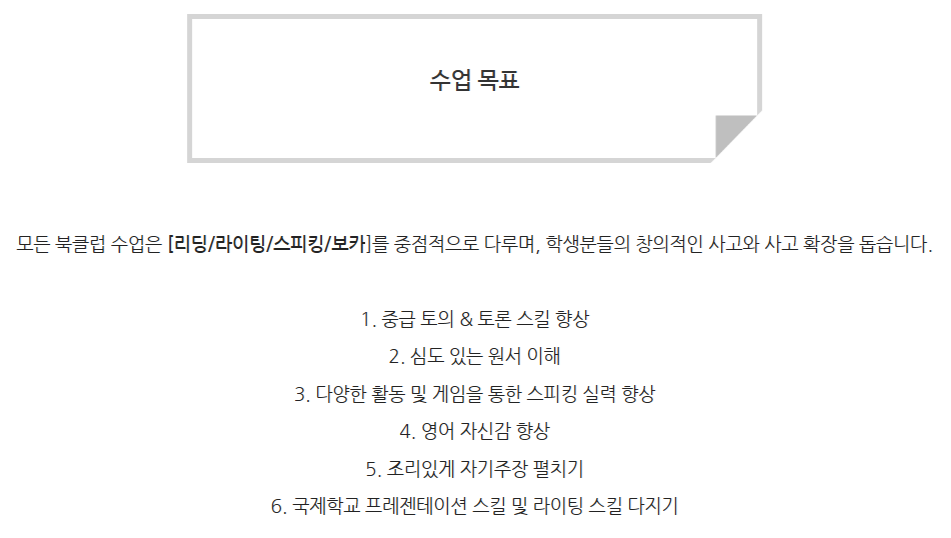국제학교 학생/해외 주재원 자녀에게 맞는 맞춤 영어 수업을 찾고 계신가요? 스피킹/토론/리딩 수업을 향상시키는 북클럽 수업으로 영재반 수업을 수강해 보세요!