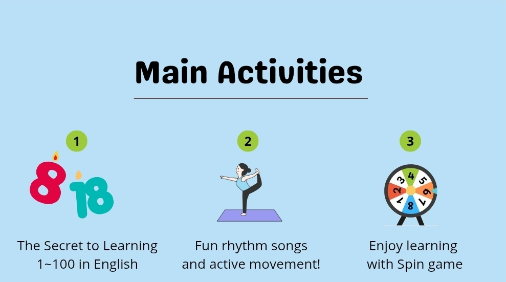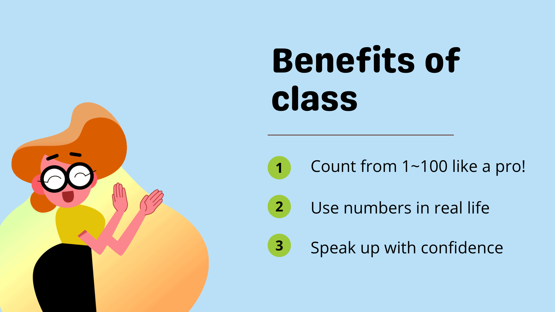 제목 : 영어로 100까지 재미 있게 숫자 세는 비밀 요약 : 실생활 대화에서 많이 쓰이는 숫자! 영어로 배워봐요! 자기소개, 쇼핑할 때도 시간을 볼 때도 일상 해서 꼭 필요한 숫자를 쉽고 재미있게 배우는 수업입니다.
