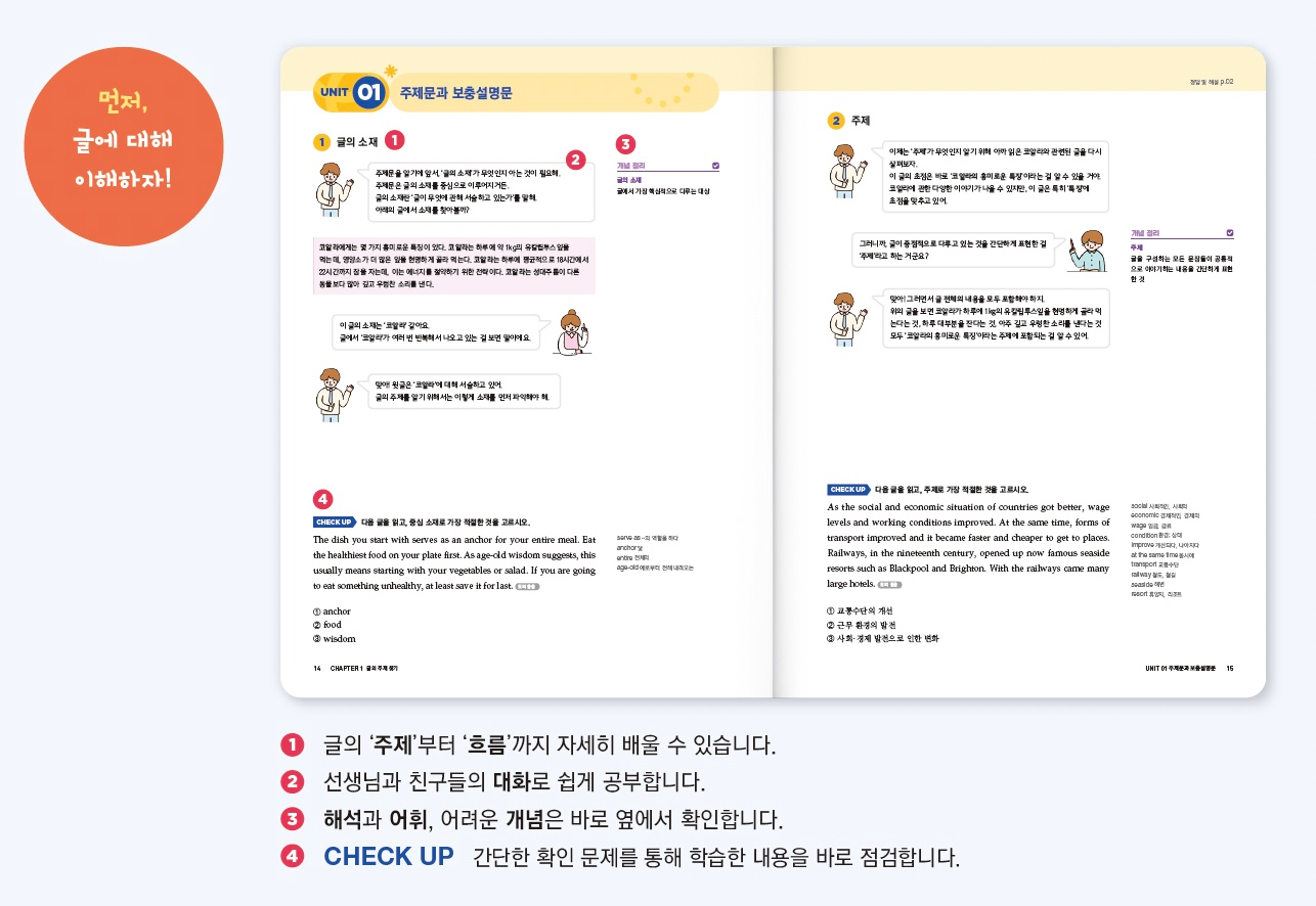 독해를 할 때 자연스럽게 의미를 연결하는 방법을 익힙니다.