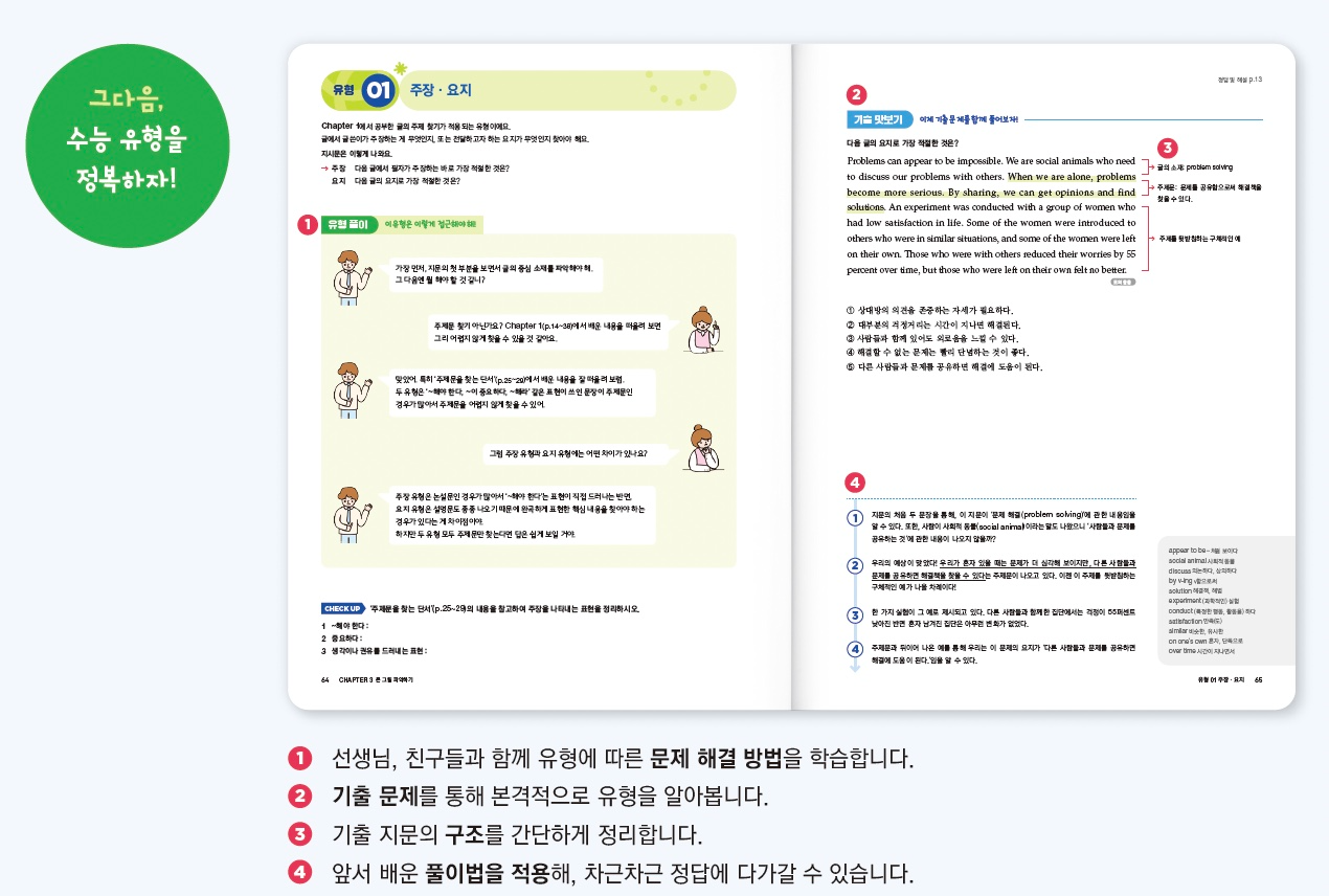 주장·요지, 주제, 제목, 목적 찾기부터 글의 순서 배열, 문장 삽입, 빈칸 추론, 요약문, 심경 등 다양한 유형을 체계적으로 학습하고, 유형별로 풀이법을 구체적으로 연습합니다.