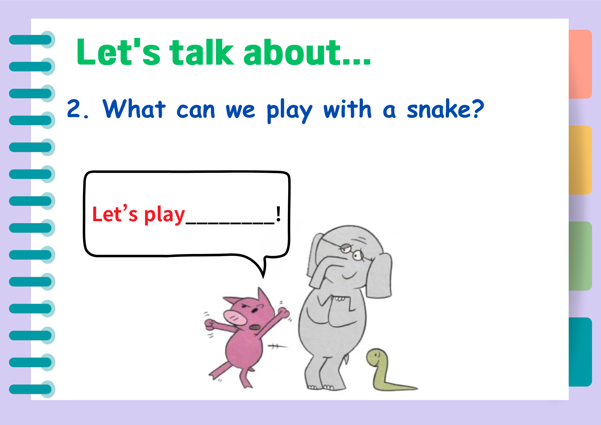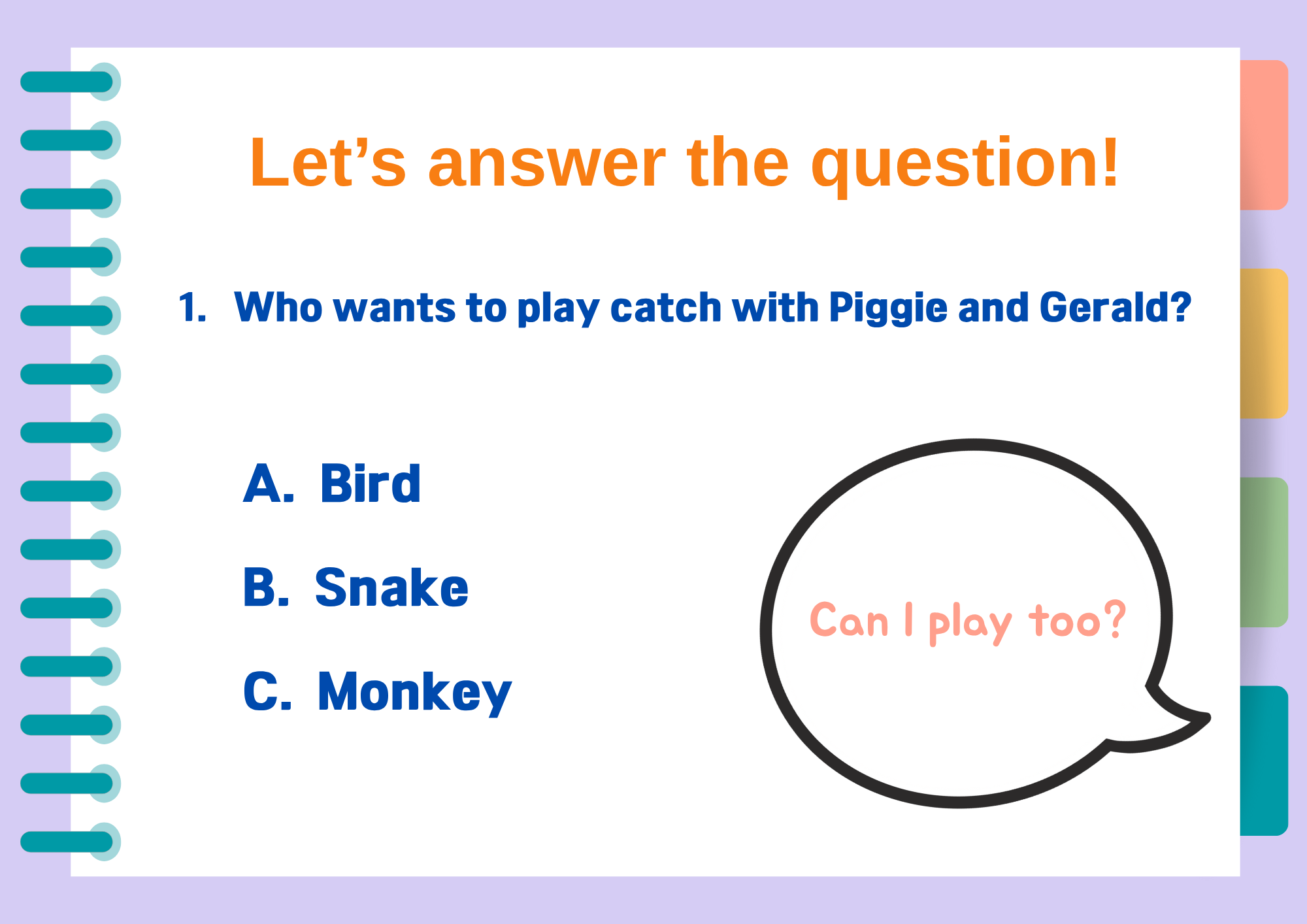 Gerald와 Piggie가 즐겁게 공 던지기를 하고 있는데, Snake가 다가와 함께 놀자고 해요. Snake는 팔이 없는데 어떻게 하면 함께 놀 수 있을까요?