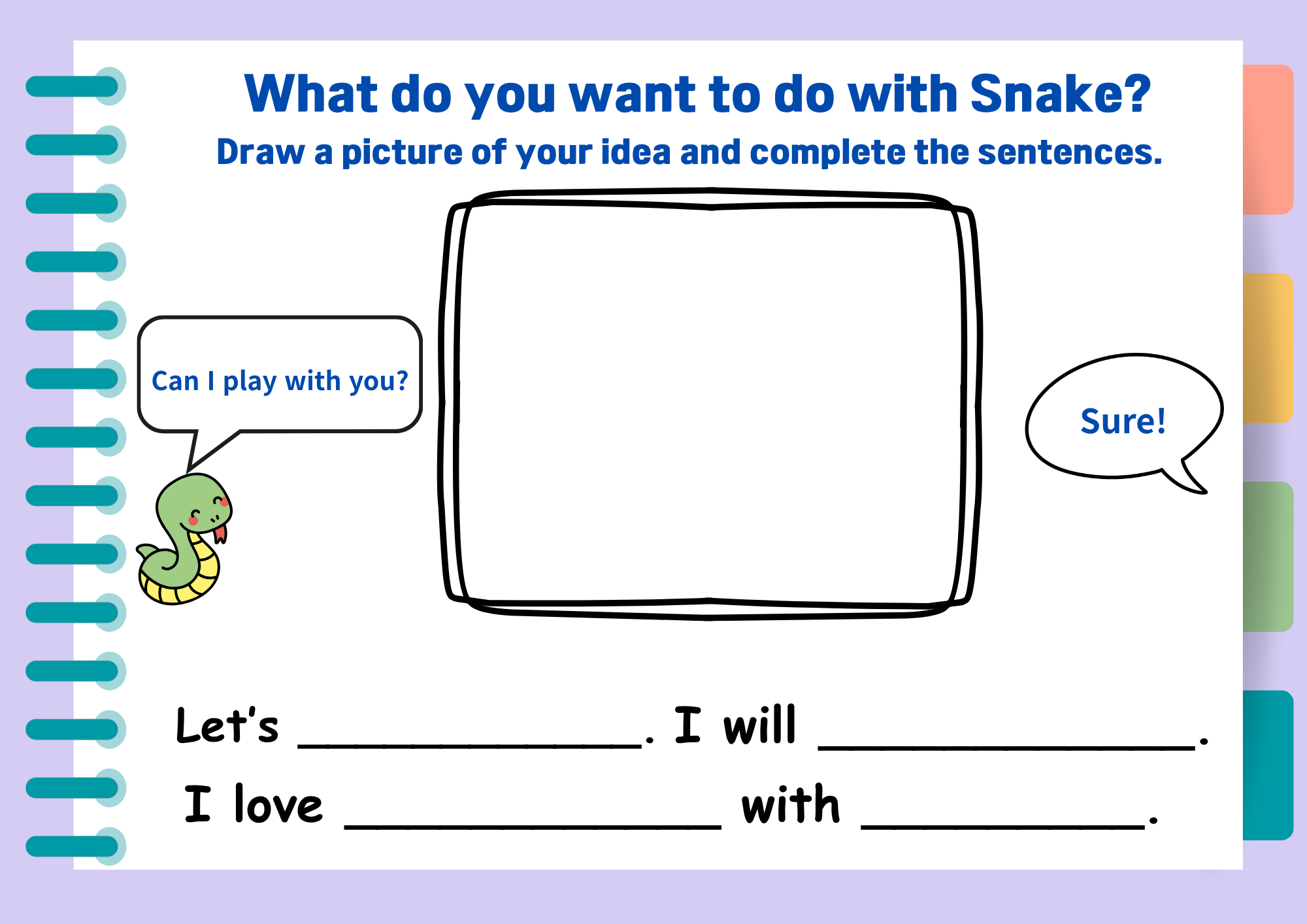 Snake와 함께할 수 있는 놀이 아이디어를 그림으로 그려보고,문장 완성하여 말하기