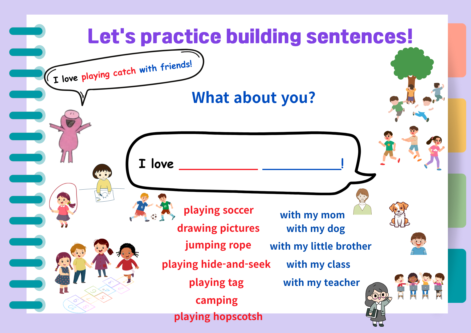 Let’s play ~., I will ~ . , I love _____ with _____ . 패턴 말하기 활동Drawing my idea (5분)