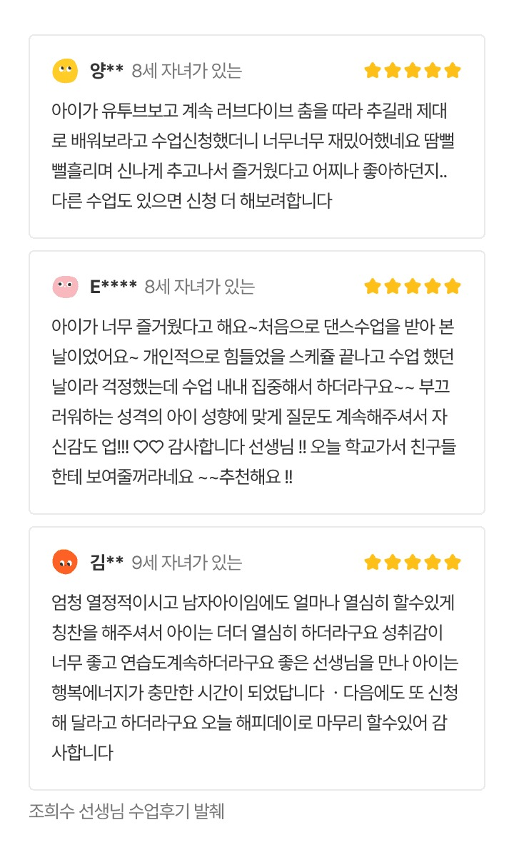 안녕하세요 친구들 :D 저는 방송댄스 강사이자 댄서로 활동중인 조희수입니다. 저는 실용무용 학사를 졸업 후, 다양한 연령층의 수업과 재미를 위해 교육의 길을 걷게 되었습니다. 지역아동센터에서 아이들과 수업을 한 이후로, 꾸준한 아이들 수업과 다문화 가정을 가르치는 수업도 진행 하였습니다! 현재는 온라인 강의나 오프라인 수업을 통해 더 다양한 아이들과 소통하기 위해 노력하고 있습니다! 아이들 눈높이에 맞춰 쉽고 자신감 까지 얻어 갈 수 있는 댄스! 비슷한 동작들을 반복해 더 쉽고 재밌게 다가 갈 수 있는 저의 댄스클래스 !! 선생님과 함께 시작할까요??