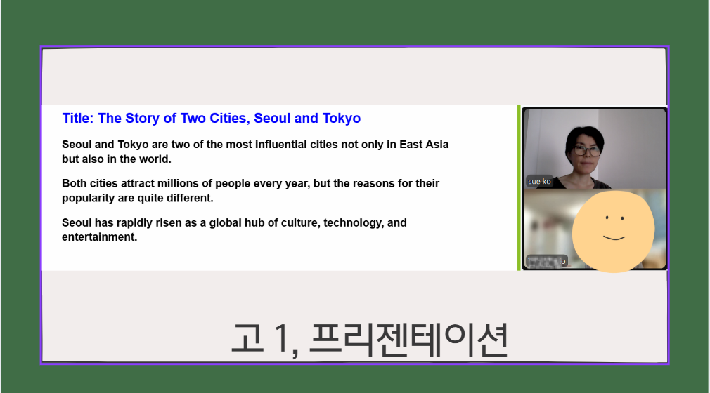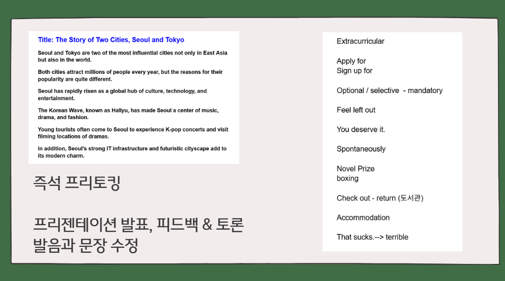 프레젠테이션 → 즉석 주제 또는 미리 상의된 주제로 프레젠테이션 준비하고 발표합니다. 내용에 대해서 토론하고 피듭백 주면서 필요한 표현들 수정하거나 추가합니다. 발표력과 영어자신감 UP되는 클래스에요.