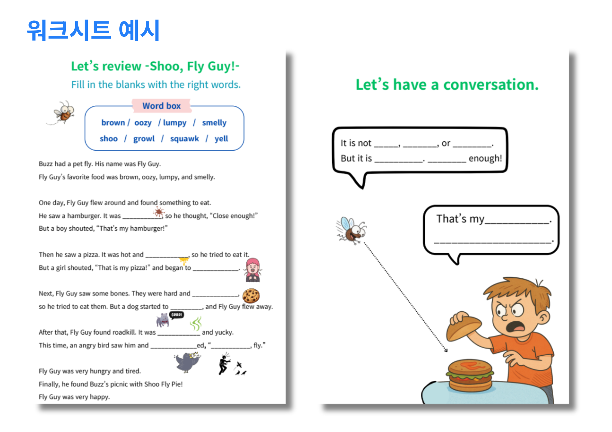 – “Would you like Fly Guy as your pet? Why?” 처럼 개인 의견 말하기