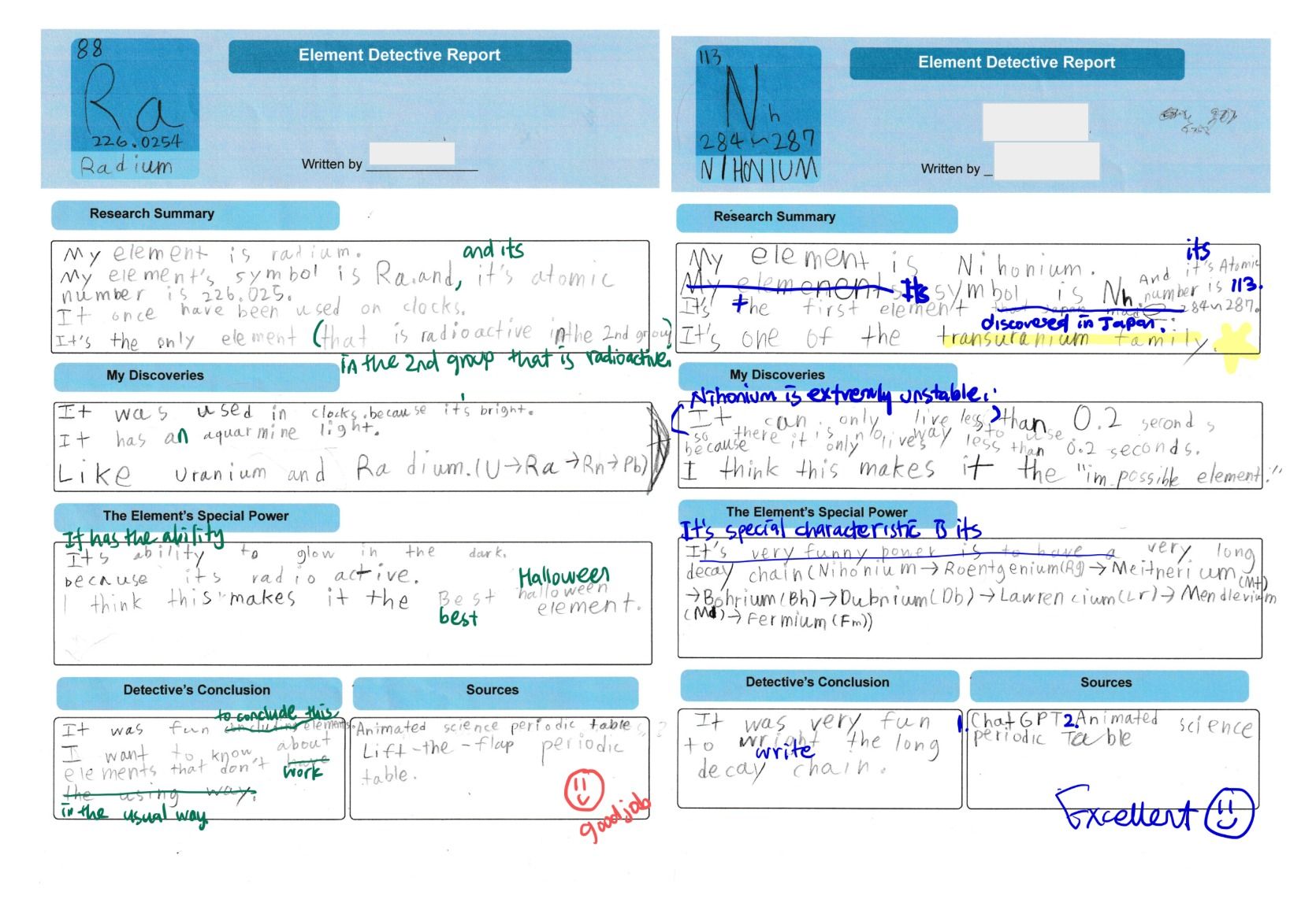 선생님이 제공하는 '원소 탐정 보고서' 템플릿 (작성 후 다음 수업까지 제출)