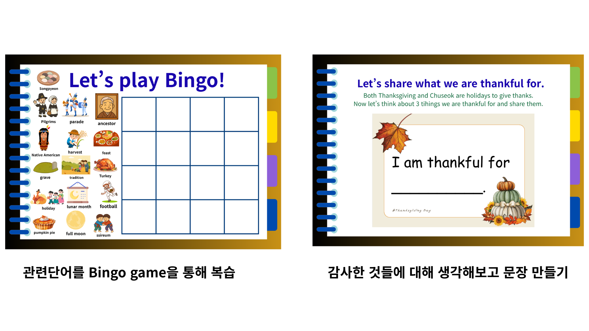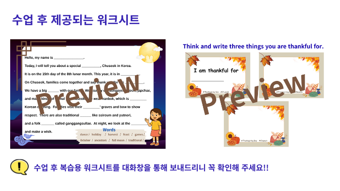 추석과 Thanksgiving을 영어로 비교하며 문화 학습과 말하기 연습을 동시에! 영어 자신감이 자라는 특별한 클래스!!