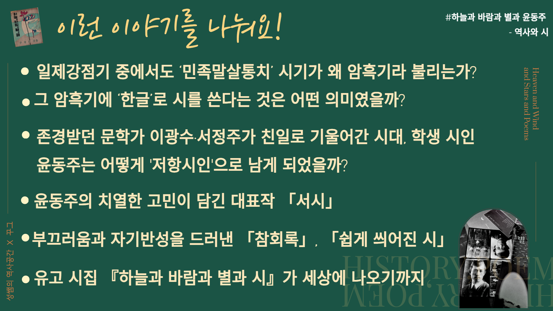 윤동주의 삶과 문학을 함께 읽는 특별한 역사 특강입니다.