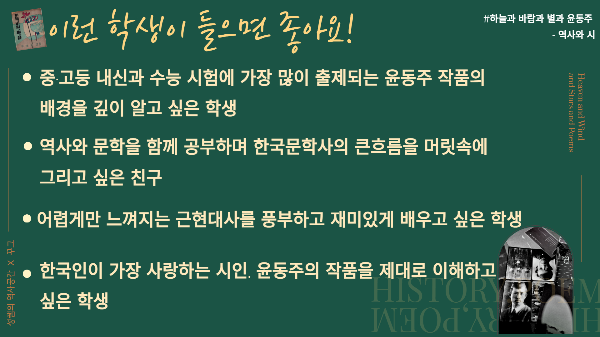 이 강의는 시만을 해석하는 문학 수업이 아닙니다. 윤동주의 삶과 시대를 함께 읽는 역사 수업입니다: )
