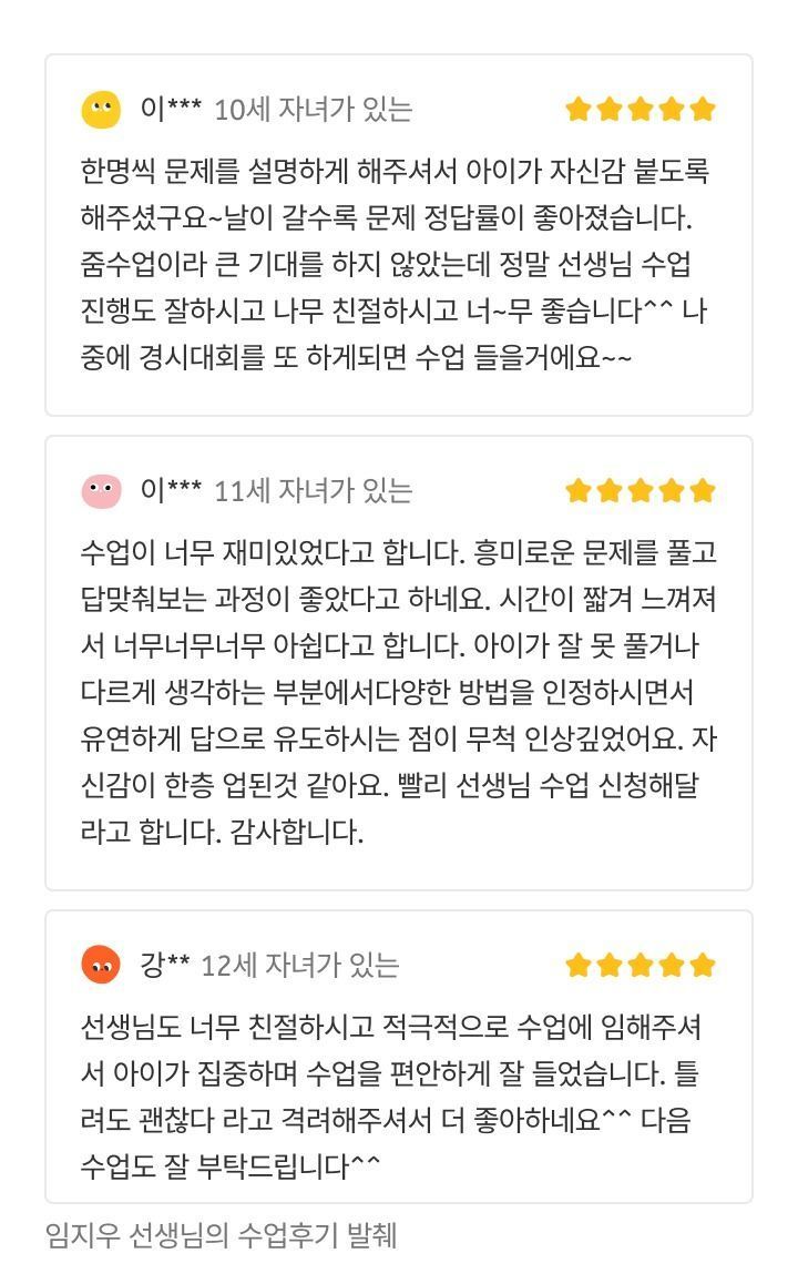 안녕하세요! 아이의 ‘생각하는 힘’을 키우는 수업을 연구하고 실천하는 임지우 선생님입니다. 😊 저는 단순히 문제를 잘 푸는 아이보다, 스스로 질문하고, 생각을 정리하며, 자신의 언어로 설명할 수 있는 아이가 진짜 실력을 가진 아이라고 믿어요. 그래서 저는 ‘지식’만 가르치기보다, 공부의 바탕이 되는 인지 능력 (주의력, 기억력, 사고력, 실행력)을 교구와 챌린지, 수업을 통해 자연스럽게 길러주고 있어요. 📚 자격 및 전문 과정 - 웩슬러 지능검사 전문가 과정 수료 - 인지학습심리상담사 2급 자격과정 이수 🧡 이런 아이에게 추천해요! ✔️ 문제는 풀지만 이해가 부족한 아이 ✔️ 글을 읽고 요약하거나 핵심을 파악하는 데 어려움이 있는 아이 ✔️ 학습 습관이 잘 잡히지 않거나, 자신감이 부족한 아이 ✔️ 새로운 방식으로 수학을 접해보고 싶은 아이 아이의 생각 근육을 키워주는 수업, 지우쌤과 함께 시작해보세요! 🧠✨