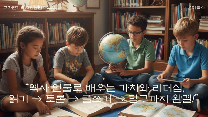교과서와 연계된 역사 인물을 매 차시 인물탐구독서로 읽고 토론하며 가치와 리더십을 배우는 수업입니다. 글쓰기와 프로젝트 결과물을 완성해 수행평가에 대비하고, 자기주도적 사고력과 성취감을 키우는 전문 독서 프로그램입니다.