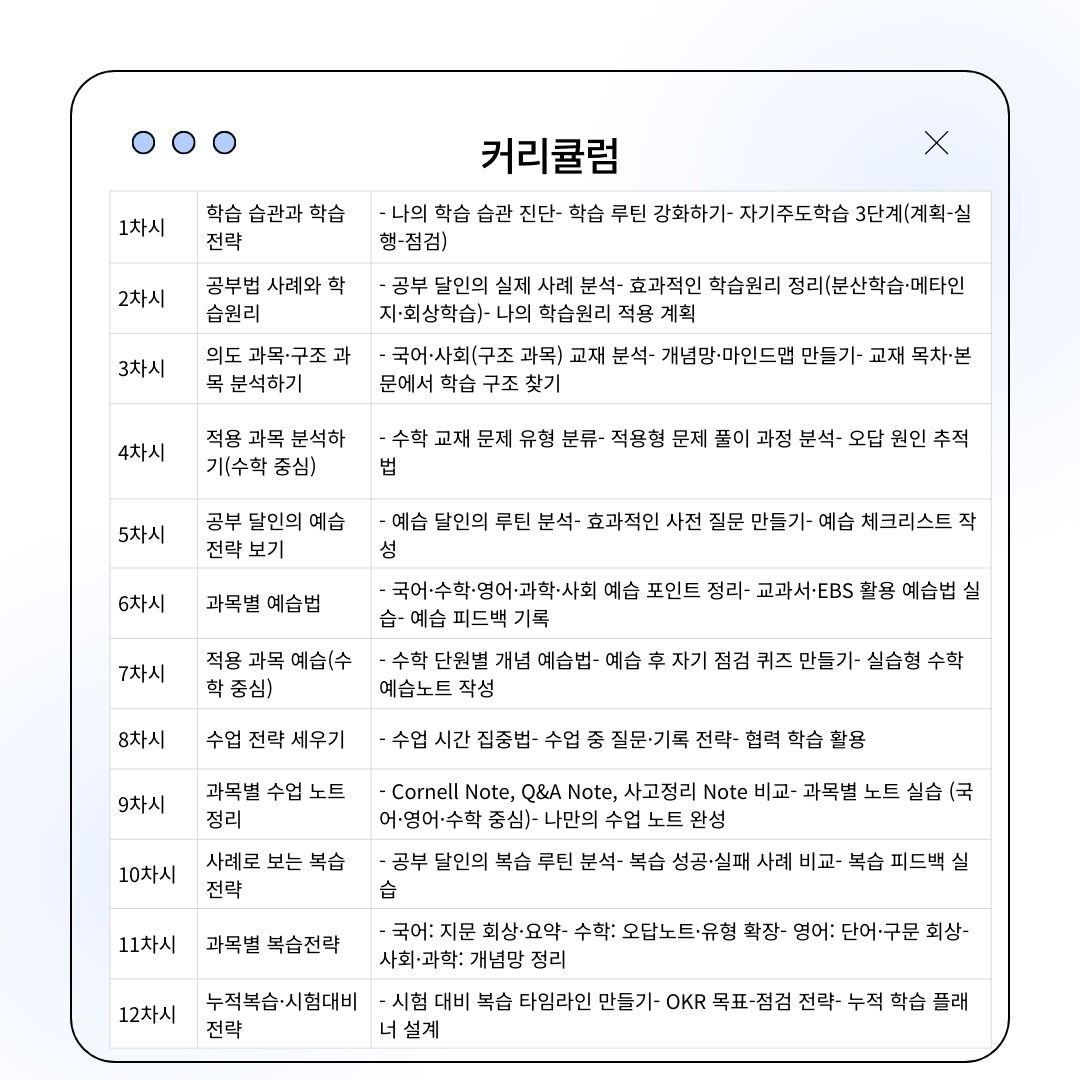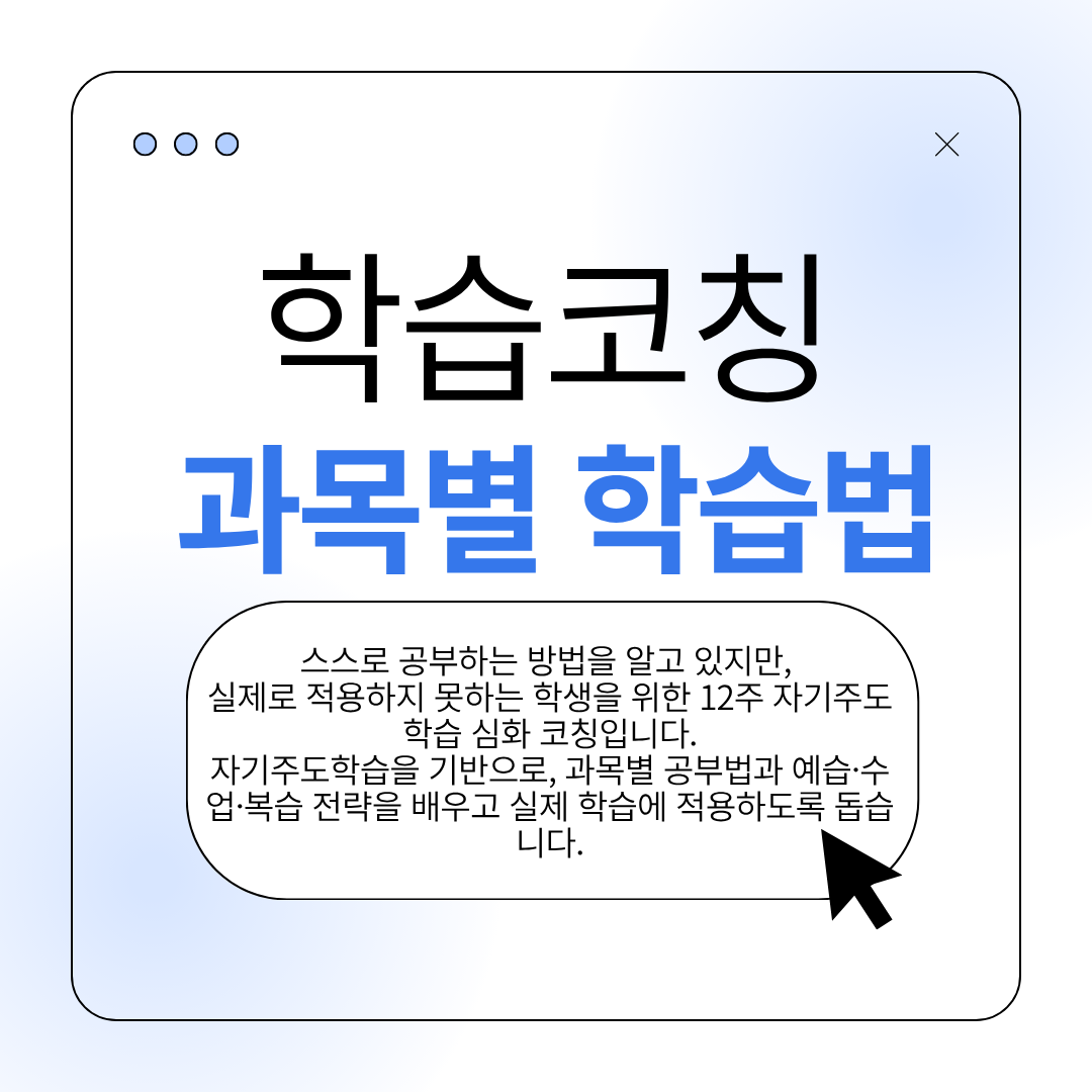 과목별 학습코칭은 ‘공부 마인드셋: 습관을 바꾸는 12주 자기주도 학습코칭’의 심화 단계입니다.