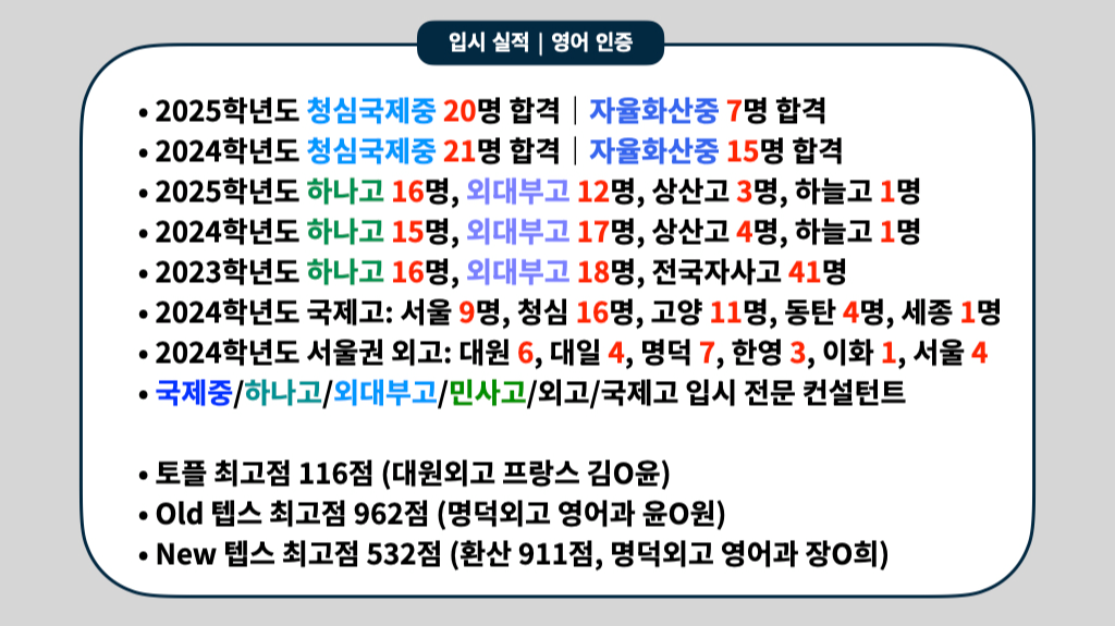 *국제중/자율중, 전사고/특목고, SKY/인서울 대입, 외대부고 하나고 국제고 외고 전문 21년차 입시 컨설턴트