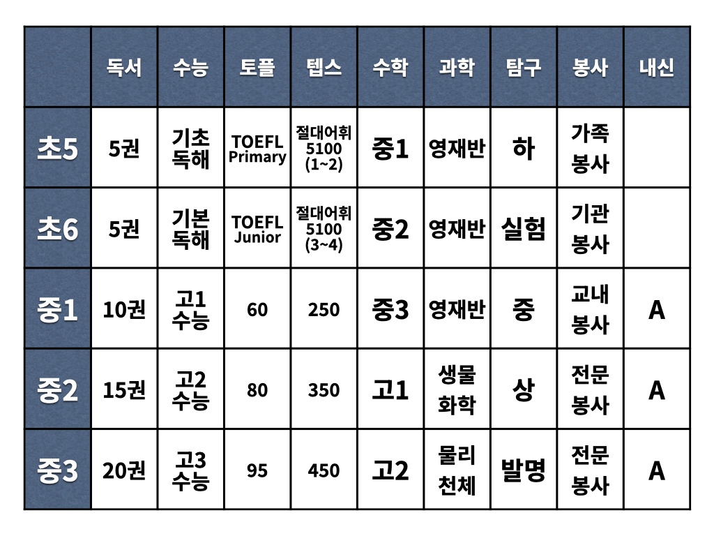 * 초등학교 시절부터 중학교 3학년 시기까지 과목별 현행 학습과 선행 학습을 어느 정도까지 진행해야하며, 실제 심화 주제 탐구의 실체가 무엇인지 알려 드립니다.