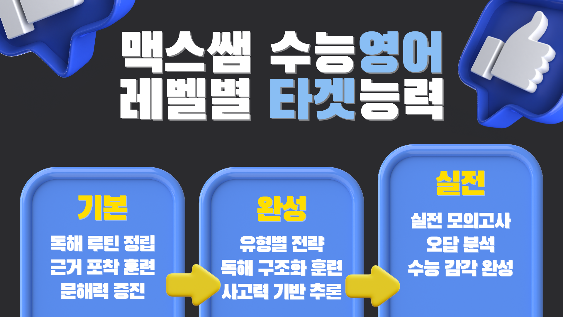 수능 영어! 단순히 암기를 넘어 대치동에서 검증된 고난도 문제풀이 전략을 전수합니다. 대기업 인사팀 경험 기반의 탁월한 멘탈 코칭으로 흔들리지 않는 학습 태도를 완성, 안정적인 1등급을 넘어 최상위권으로 이끌어 드립니다. 맥스쌤과 함께 꿈꾸는 대학의 문을 활짝 여세요!