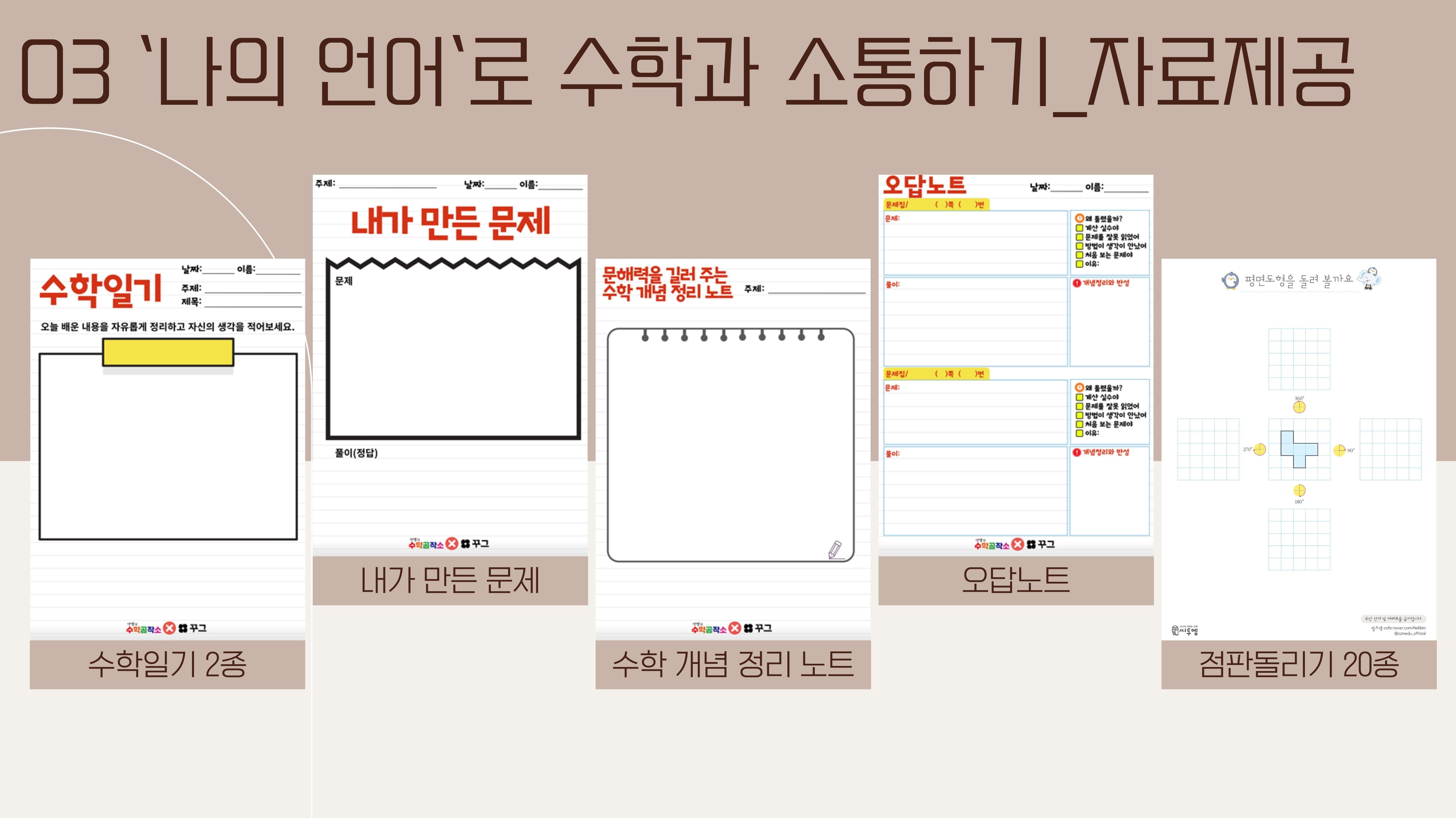 강의에 출석한 모든 분들께 "3부 나의 언어로 수학과 소통하기"에서 사용한 자료 5종 파일을 드립니다.
