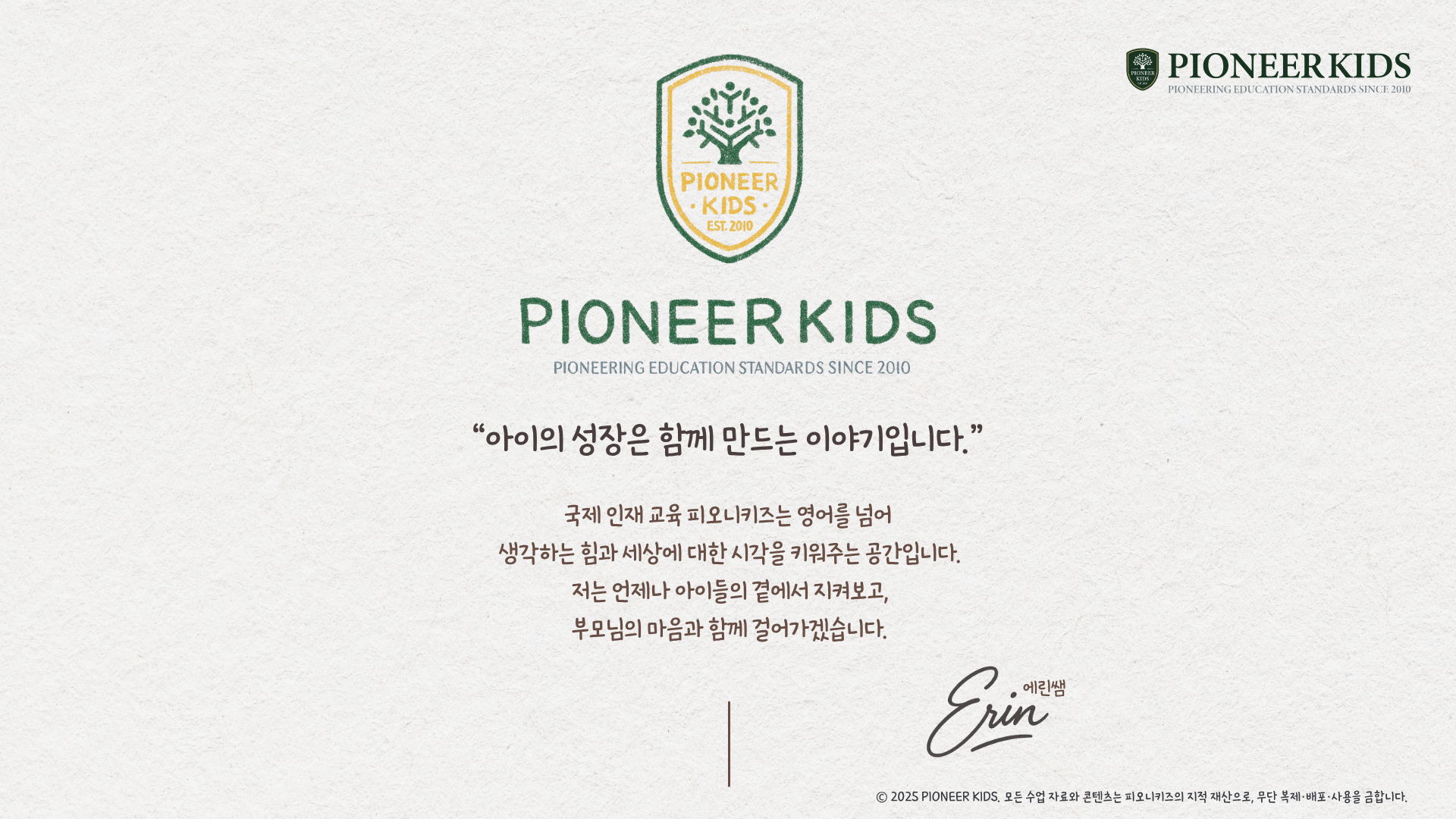 글로벌 인재로의 첫걸음, Pioneer Kids에서 시작하세요! 안녕하세요, 미국식 국제교육 전문 기관 Pioneer Kids의 원장 에린쌤 (Ms. Erin) 입니다. 한국 대치동에서 어린 시절을 보낸 후 2006년 미국 버지니아로 이주해 현지 공교육과 문화 속에서 성장하며 15년 이상 교육 현장에 몸담아왔습니다. 미국 버지니아 연방 주립대학교 (Virginia Commonwealth University)에서 생물학(Biology)과 심리학(Psychology)을 전공하고 미국 페어펙스 카운티 사립 영재 유치원을 직접 운영하며 STEAM 융합 과학 수업과 영어 영재교육 프로그램을 개발했습니다. 저는 단순한 영어 교육을 넘어 아이들이 지식·언어·탐구력을 동시에 키워 글로벌 무대에서 자신 있게 빛날 수 있도록 돕는 수업을 만듭니다. 현재 꾸그에서는 미국 현지 교육을 기반으로 한 Vocabulary Workshop 시리즈 TED-ed 똑똑한 아이를 위한 알쓸신잡 시리즈 Newbery & 명작 북클럽, etc. 폭 넓고 다양한 융합-영재형 수업들을 운영하고 있습니다. Pioneer Kids의 모든 수업은 미국 현지 수업처럼 토론과 사고 중심으로 진행되며 학생 개개인의 호기심과 잠재력을 세계로 확장시키는 것을 목표로 합니다.