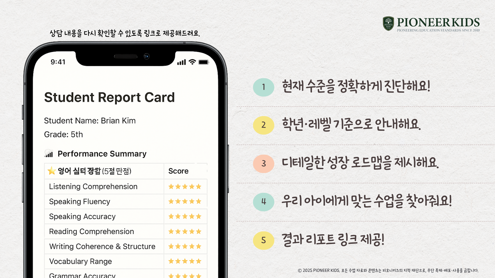 피오니키즈의 교육 철학이 담긴 온라인 영어 진단 수업은 아이의 현재 영어 실력을 단순히 점수로 평가하지 않습니다. 아이의 개성과 생각을 발견할 수 있는 열린 질문을 통해 우리 아이에게 딱! 필요한 우리 아이만의 ‘맞춤 영어 로드맵’을 함께 만들어가는 여정입니다!