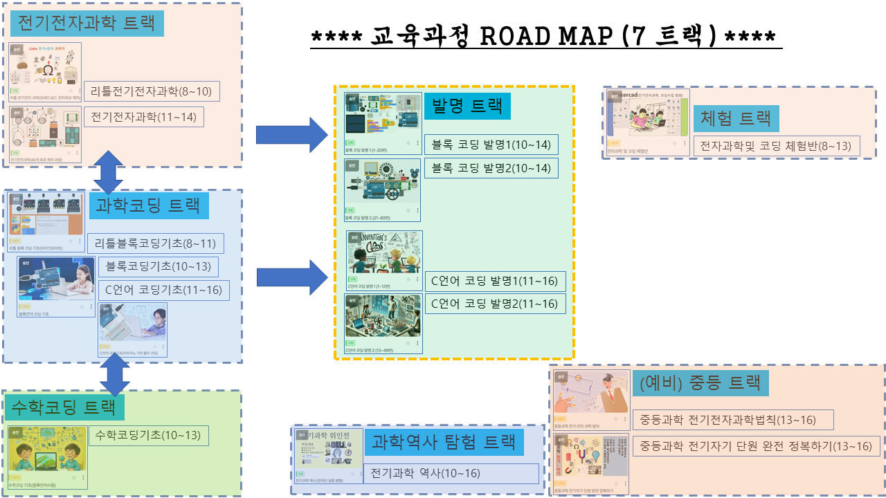 또한 고등 과학교과와 연결된 "고등부 물리 1,2 전기자기 단원 " 교과 수업을 함께 수강하여 이론과 실습을 함께 하는 것도 권해드립니다. 아래 표는 현재 운영중인 교육과정을 정리한 것입니다.