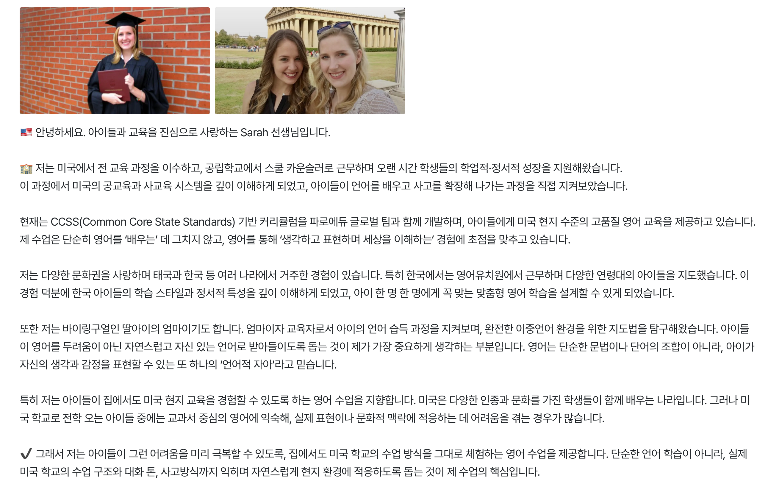 🇺🇸 안녕하세요. 아이들과 교육을 진심으로 사랑하는 Sarah 선생님입니다. 🏫 저는 미국에서 전 교육 과정을 이수하고, 공립학교에서 스쿨 카운슬러로 근무하며 오랜 시간 학생들의 학업적·정서적 성장을 지원해왔습니다. 이 과정에서 미국의 공교육과 사교육 시스템을 깊이 이해하게 되었고, 아이들이 언어를 배우고 사고를 확장해 나가는 과정을 직접 지켜보았습니다. 현재는 CCSS(Common Core State Standards) 기반 커리큘럼을 파로에듀 글로벌 팀과 함께 개발하며, 아이들에게 미국 현지 수준의 고품질 영어 교육을 제공하고 있습니다. 제 수업은 단순히 영어를 ‘배우는’ 데 그치지 않고, 영어를 통해 ‘생각하고 표현하며 세상을 이해하는’ 경험에 초점을 맞추고 있습니다. 저는 다양한 문화권을 사랑하며 태국과 한국 등 여러 나라에서 거주한 경험이 있습니다. 특히 한국에서는 영어유치원에서 근무하며 다양한 연령대의 아이들을 지도했습니다. 이 경험 덕분에 한국 아이들의 학습 스타일과 정서적 특성을 깊이 이해하게 되었고, 아이 한 명 한 명에게 꼭 맞는 맞춤형 영어 학습을 설계할 수 있게 되었습니다. 또한 저는 바이링구얼인 딸아이의 엄마이기도 합니다. 엄마이자 교육자로서 아이의 언어 습득 과정을 지켜보며, 완전한 이중언어 환경을 위한 지도법을 탐구해왔습니다. 아이들이 영어를 두려움이 아닌 자연스럽고 자신 있는 언어로 받아들이도록 돕는 것이 제가 가장 중요하게 생각하는 부분입니다. 영어는 단순한 문법이나 단어의 조합이 아니라, 아이가 자신의 생각과 감정을 표현할 수 있는 또 하나의 ‘언어적 자아’라고 믿습니다. 특히 저는 아이들이 집에서도 미국 현지 교육을 경험할 수 있도록 하는 영어 수업을 지향합니다. 미국은 다양한 인종과 문화를 가진 학생들이 함께 배우는 나라입니다. 그러나 미국 학교로 전학 오는 아이들 중에는 교과서 중심의 영어에 익숙해, 실제 표현이나 문화적 맥락에 적응하는 데 어려움을 겪는 경우가 많습니다. ✔️ 그래서 저는 아이들이 그런 어려움을 미리 극복할 수 있도록, 집에서도 미국 학교의 수업 방식을 그대로 체험하는 영어 수업을 제공합니다. 단순한 언어 학습이 아니라, 실제 미국 학교의 수업 구조와 대화 톤, 사고방식까지 익히며 자연스럽게 현지 환경에 적응하도록 돕는 것이 제 수업의 핵심입니다. 저는 영어를 잘 가르치는 선생님을 넘어, 아이가 새로운 환경에서도 자신감을 가지고 스스로 성장할 수 있도록 돕는 든든한 조력자가 되고 싶습니다. 미국 학교 그대로의 생생한 수업! Sarah 선생님과 함께 멋진 교육 경험을 만들어가요 ❤️
