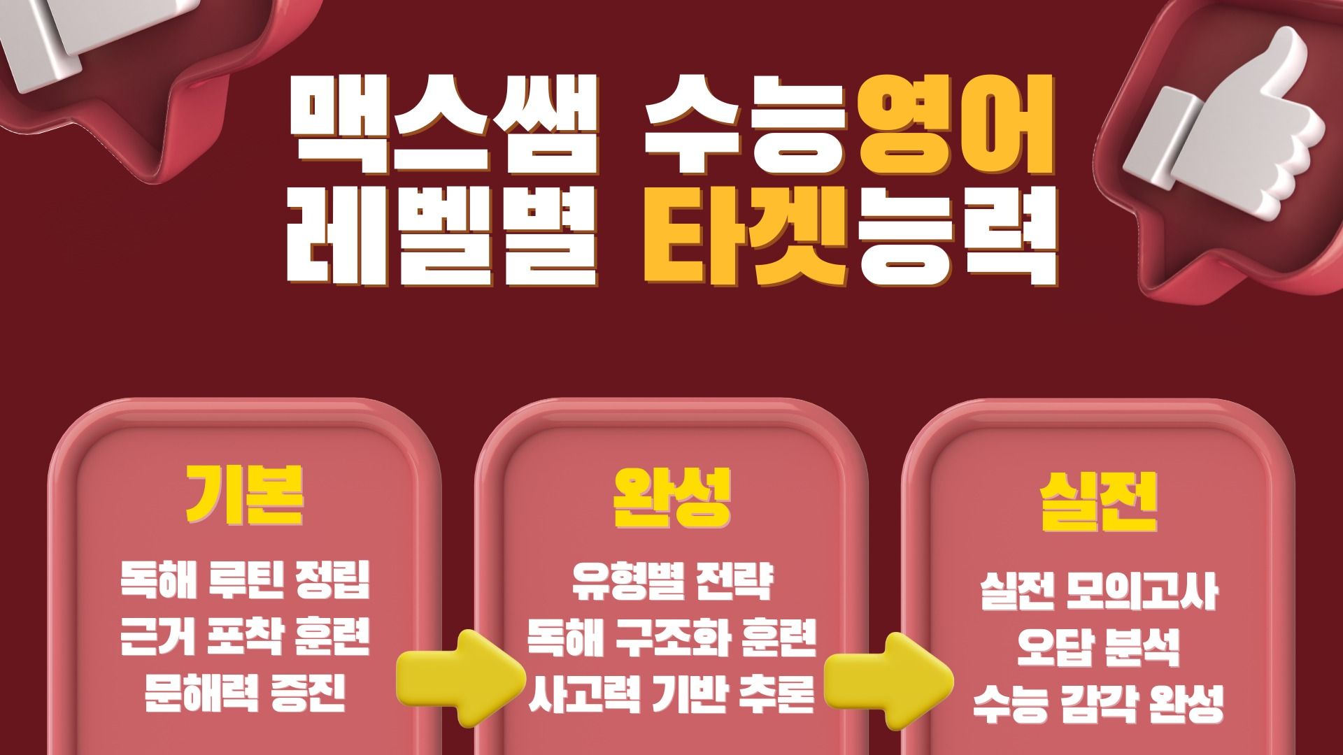 수능 영어! 단순히 암기를 넘어 대치동에서 검증된 고난도 문제풀이 전략을 전수합니다. 대기업 인사팀 경험 기반의 탁월한 멘탈 코칭으로 흔들리지 않는 학습 태도를 완성, 안정적인 1등급을 넘어 최상위권으로 이끌어 드립니다. 맥스쌤과 함께 꿈꾸는 대학의 문을 활짝 여세요!