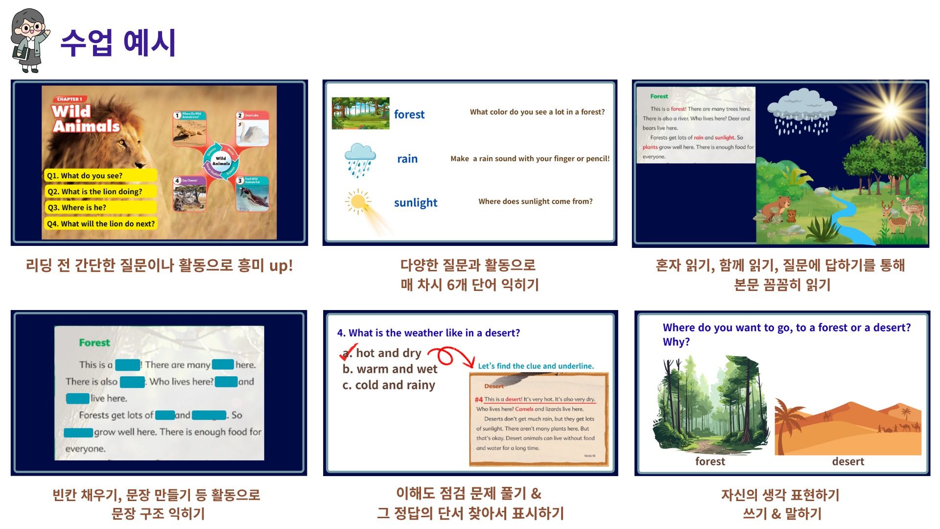 수업은 기본적으로 영어로 진행하고, 아이들이 이해하기 어려운 부분은 간단하게 한국어로 설명을 덧붙이는 방식으로 진행합니다.