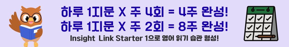겨울방학 동안 하루 한 지문씩, Insight Link Starter 1으로 영어 리딩 루틴을 만듭니다. 읽고 말하고 쓰며 어휘력과 사고력을 키우는 30분 구독 수업이에요.