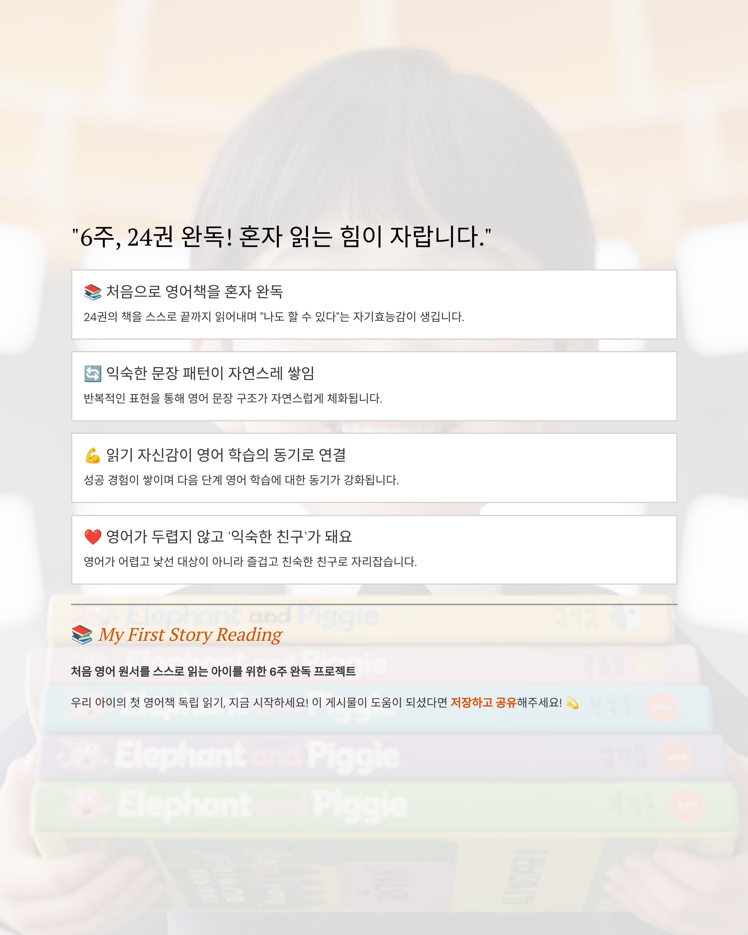 아이가 혼자 읽지 못해도 괜찮습니다. → 목표는 ‘완벽한 이해’가 아닌 **‘끝까지 읽는 경험’**입니다.