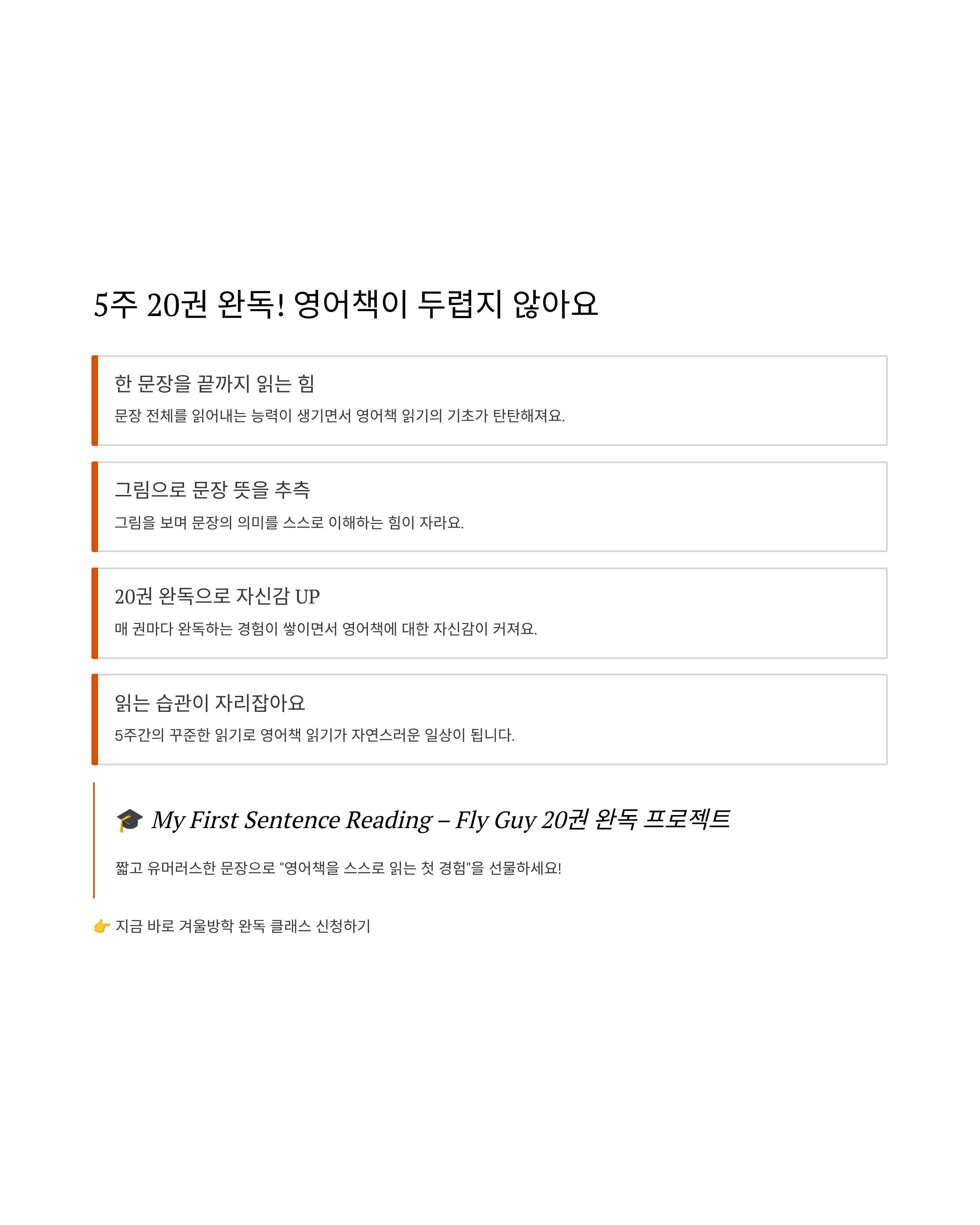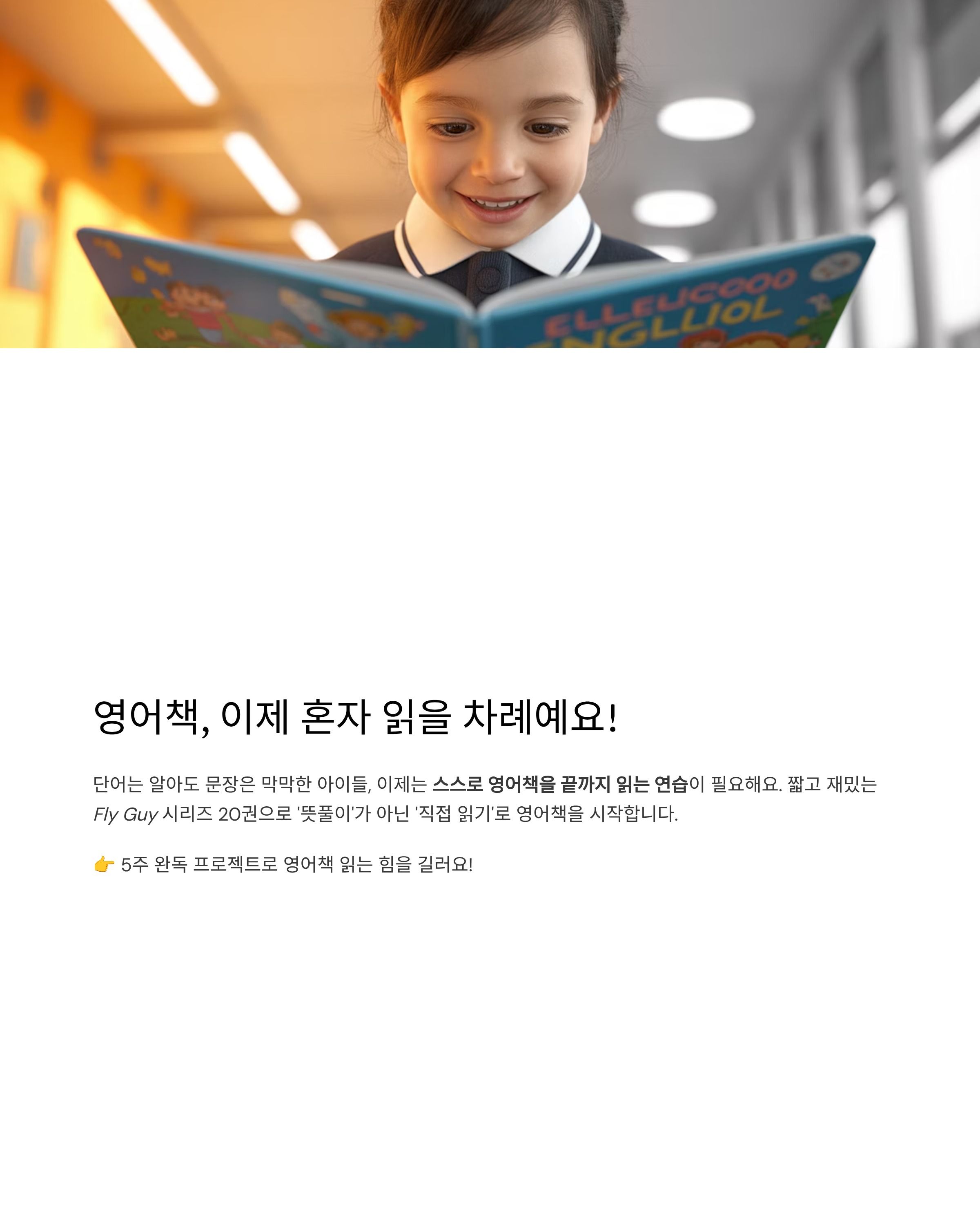 Tedd Arnold의 Fly Guy 20권으로 짧은 영어 문장을 직접 읽는 힘을 키워요. 선생님과 번갈아 읽으며 완독하는 5주 리딩 훈련! 뜻보다 **‘끝까지 읽는 경험’**에 집중하는 영어책 첫걸음 프로그램입니다.