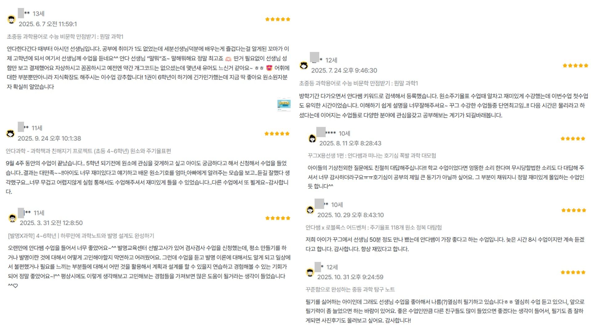 꾸그 과학 수업 누적 후기 1,000여개, 5.0점 유지