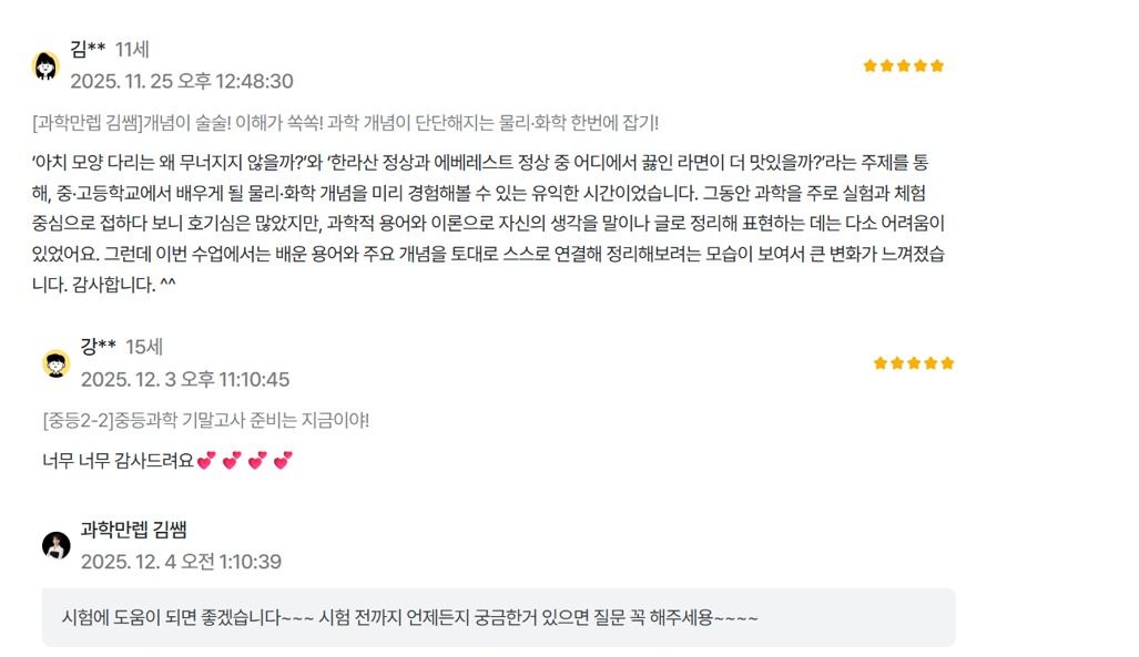 🎓 믿고 맡기는 과학 선생님! ‘과학만렙 김쌤’ 입니다 안녕하세요, 과학 교육 경력 15년 이상! 전자공학, 물리를 전공하고 영재교육 석사를 졸업, 아이들 교육을 고민하며 교육학 박사과정을 진행하면서 학생 눈높이에 맞춘 과학 수업을 진행하는 과학만렙 김쌤입니다. 🧠 어려운 과학? NO! 기초부터 탄탄히, 내신은 물론 심화 개념까지 완벽하게! 아이들이 과학을 ‘이해’하고 ‘재미있게’ 느낄 수 있도록 만드는 수업, 그것이 바로 과학만렙 온라인 클래스입니다. 🚀 왜 김쌤의 수업이어야 할까요? • 기초부터 심화, 입시까지 완벽 마스터 어려운 개념도 쉽게! 내신 성적 향상은 기본이며, 영재고·과학고·특목고 대비를 위한 심화 개념까지 빈틈없이 지도합니다. • 맞춤형 진로 & 학습 코칭 아이의 성향을 분석하는 진로적성상담과 스스로 공부하는 힘을 기르는 자기주도학습 가이드를 통해 과학 점수 그 이상의 '공부 자신감'을 심어줍니다. • 융합형 인재 양성: 아낌없는 지원과 미래 교육에 대한 깊은 이해를 바탕으로, 인공지능지도사 1급 및 ChatGPT 융합교육지도사 자격증을 취득하여 미래 사회가 요구하는 융합 영재 교육을 선도합니다. • 검증된 교육 콘텐츠 전문가: 다수의 교육 콘텐츠 개발 및 저술 경험(로블록스, 사이언스데이, 코딩랩 영재과학 시리즈 등)을 통해 아이들의 흥미를 자극하고 학습 효과를 극대화하는 맞춤형 콘텐츠를 제공합니다. 🎓부산영재고, 용인외고, 상산고 등 다수 지도 하였습니다. 🎓수행평가, 내신대비는 과학만렙 김쌤과 함께 해보세요! 📝 학부모님께 드리는 약속: 믿고 맡겨주시면, 우리 아이가 과학에 흥미를 느끼고 스스로 깨우치는 즐거움을 통해 성적 향상과 더불어 미래를 준비하는 힘을 길러주겠습니다. 수행평가, 내신 대비도 과학 만렙 김쌤과 함께하세요!