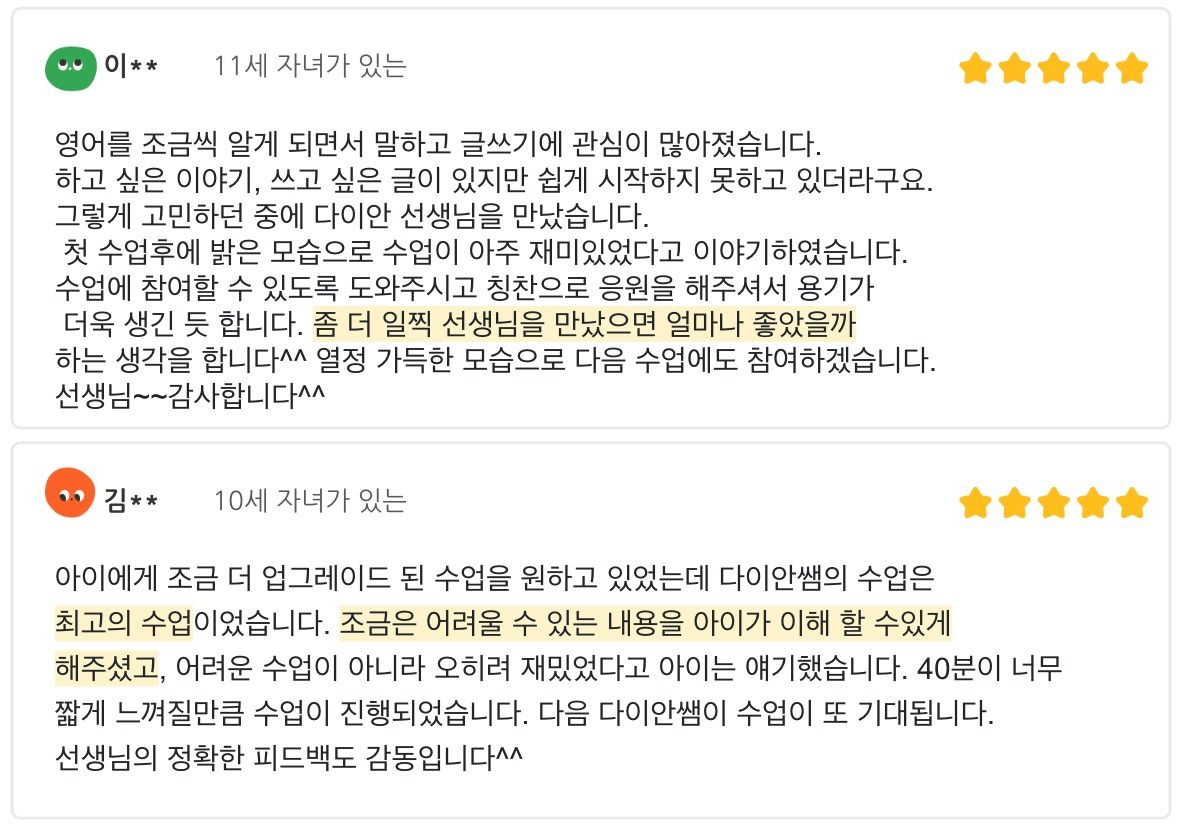[100%영어] 간단한 문장쓰기에서 스스로 주제문을 완성하는 아이로 '확실하게 변화'되는 경영전문가 다이안 선생님의 프리미엄 라이팅클래스! 체계적 코칭과 맞춤 첨삭으로 어휘력·표현력과 글쓰기 실력이 모두 눈부시게 성장하는 멋진 경험! 함께 만들어가요🌈