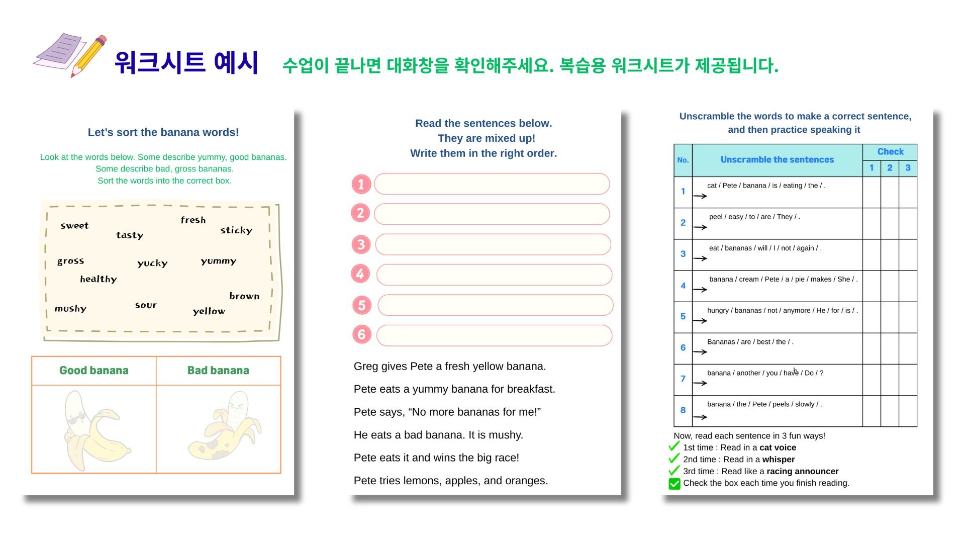 말하기·읽기·쓰기 활동이 균형 있게 포함된 리딩 기초 완성 수업입니다.