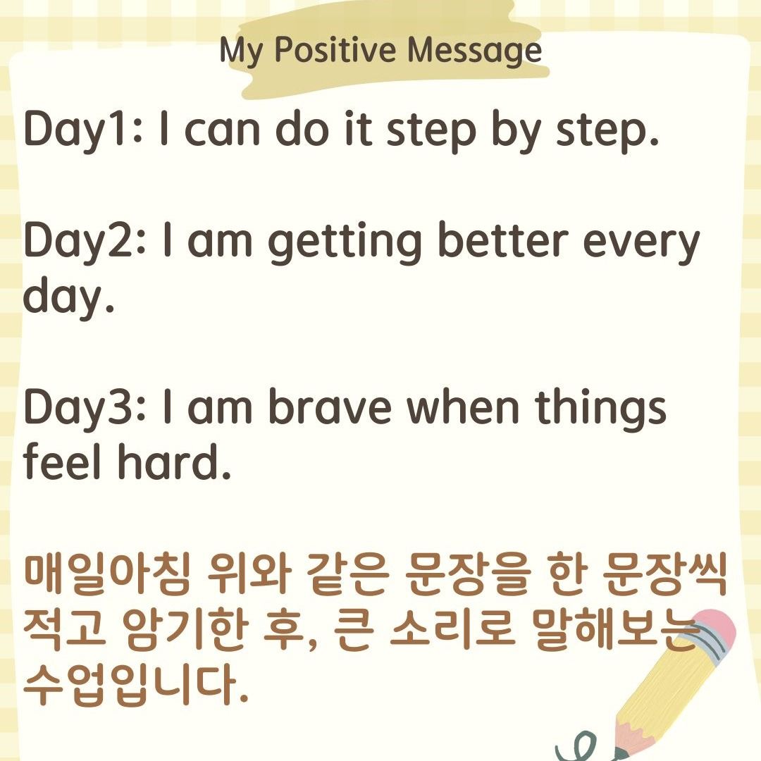짧은 시간이지만, 매일같이 영어로 좋은 말을 외치다 보면 영어 문장도 자연스럽게 익히고, 스스로를 격려하는 마음도 커져요. 아침마다 자신 있는 목소리로 “I can do it!”을 외치는 우리 아이, 영어는 물론 자신감도 함께 자라날 거예요. 부담 없이 시작할 수 있는 10분 루틴, 바쁜 학교생활에도 쏙 들어가니 첫 영어 스피킹 습관 만들기에 정말 딱이에요!