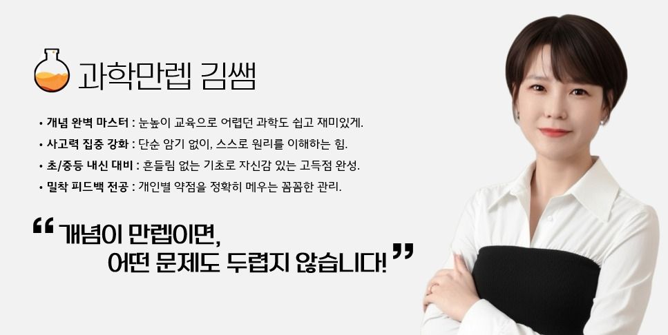 💡 과학에 대한 '흥미'와 '자신감'을 심어주는 친절한 강의: 어려운 과학 용어를 쉽게 풀이하고, 실생활 예시를 풍부하게 들어 과학을 재미있는 과목으로 느끼게 합니다. 반복 설명과 격려를 통해 과학 문제 풀이에 막혀있던 아이도 *"나도 과학을 잘할 수 있다!"*는 자신감을 가질 수 있습니다.