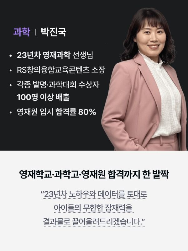 안녕하세요. 창의융합교육전문 박진국입니다. 아이들의 무한한 잠재력을 끌어올려서 실현케하는 시너지촉매가 되어 드리겠습니다. 저를 만나면 공부가 재밌고 즐거워지며 아이들의 재능을 발견해주고 또 동기부여도 해주면서 좋아하는 것과 잘 하는 것을 찾도록 해서 꿈을 실현하도록 돕습니다. 22년 넘게 영재교육분야에서 학생들을 지도하면서 교과 뿐만아니라 비교과적인 영역 등 다양하게 수업을 진행했고, 또 특히 영재원입시와 수학과학영재교육, 학습코칭, 진로코칭 등 다양한 맞춤교육을 하고 있습니다. 현재 RS창의융합교육컨텐츠 소장으로 다양한 교육컨텐츠를 개발하고 있고, 리얼슾영재아카데미원장을 하면서 꾸준하게 오프라인으로도 아이들을 지도하고 있습니다. 영재원산출물, 발명대화, 자유탐구대회, 창의력대회, 과학전람회, 과학토론대회, 학생탐구대회, 융합대회, 동아리대회 등 다양한 대회의 대비 경력과 수상자배출을 하고 있습니다. 이젠 꾸그에서도 영재교육에 대한 전문 수업에 대한 목마름 갈증을 해소해보시기 바랍니다. 저와 함께 프리미엄 시그니처 영재교육의 리얼맛을 누려보세요! 곧 만나요~! 감사합니다.
