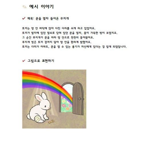 이야기를 글로 설명하고 그림으로 표현하는 과정을 통해 생각을 정리하는 힘, 자신의 생각을 끝까지 표현하는 힘이 자랍니다.