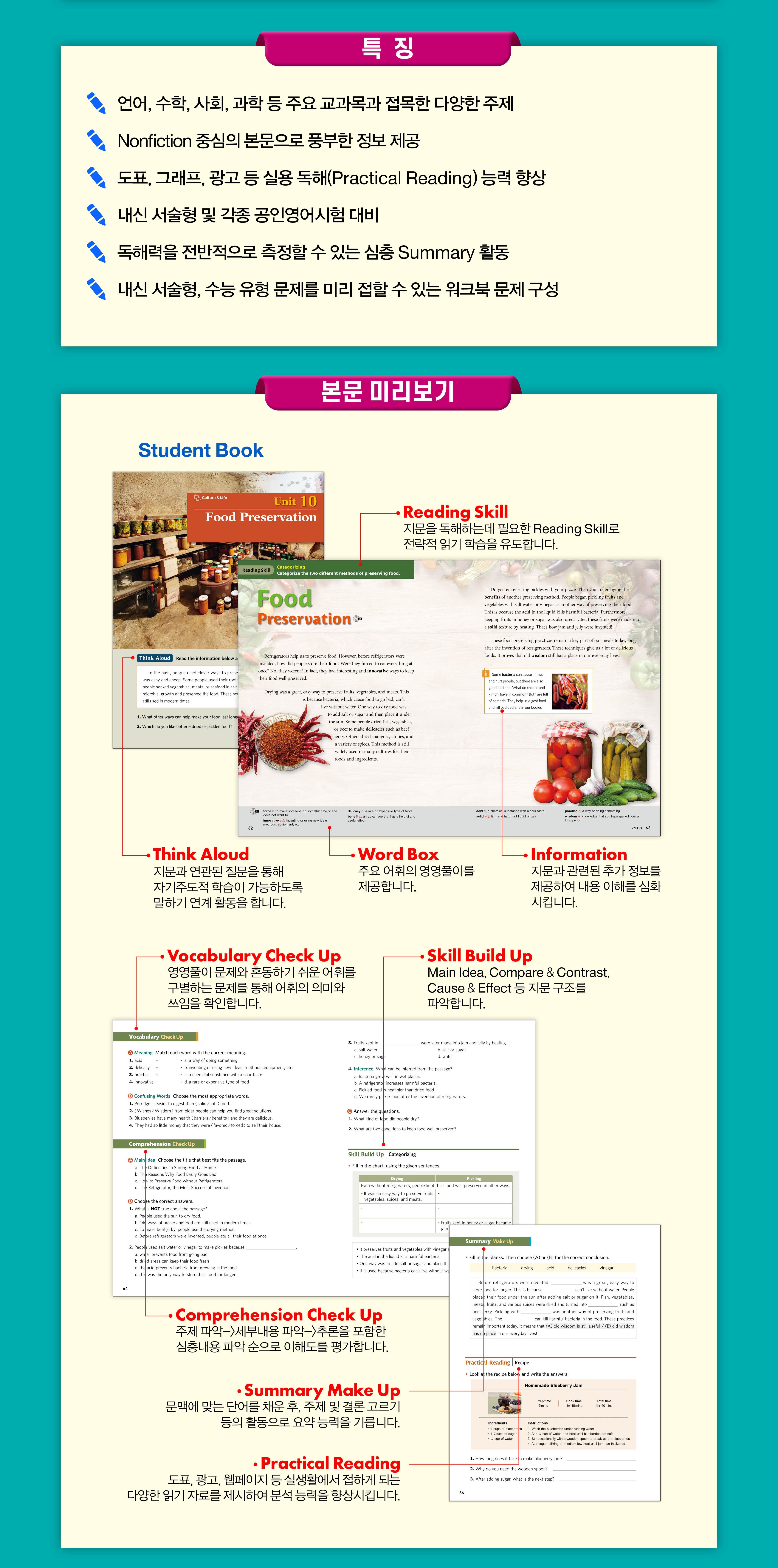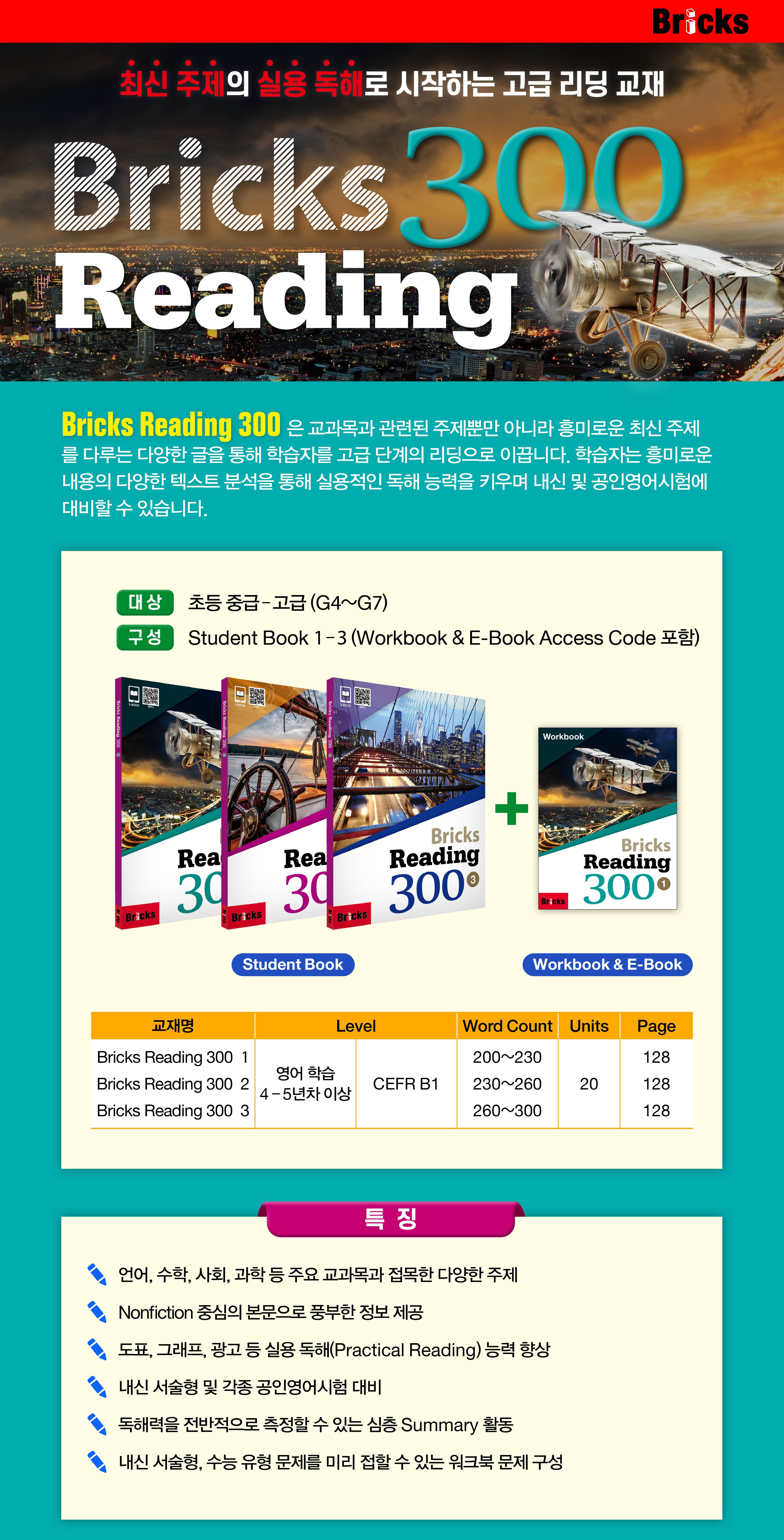 브릭스 리딩 시리즈 300 - 레벨1 수업을 통해 다양한 주제학습을 해보아요! (AR 4.0 이상, Lexile 600L 수준) • Nonfiction 중심 패시지로 풍부한 정보 • Four Skills의 주제 찾기, 세부 내용, 추론 문항, 단계별 문제 구성