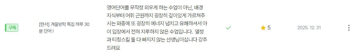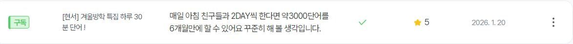 이 수업은 짧은 시간이지만 매일 꾸준히 단어를 접할 수 있게 도와줘요. 그날 배운 단어를 곧바로 점검하며, 일정 기간마다 단계적으로 실력을 쌓다 보면 자연스럽게 영어 단어가 생활 속에 스며들 거예요. “외우고 잊어버리는” 반복에서 벗어나, 실천하는 단어 암기 습관을 경험해보세요!