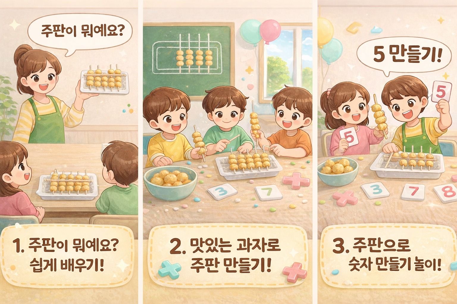 주판이 처음인 아이도 하루 만에, 과자를 알처럼 끼워 1~9까지 직접 만들며 수의 구조와 주산의 원리를 자연스럽게 익혀요! 만들기 + 놀이 + 체험이 한 번에 끝나는 즐거운 수학 활동입니다.