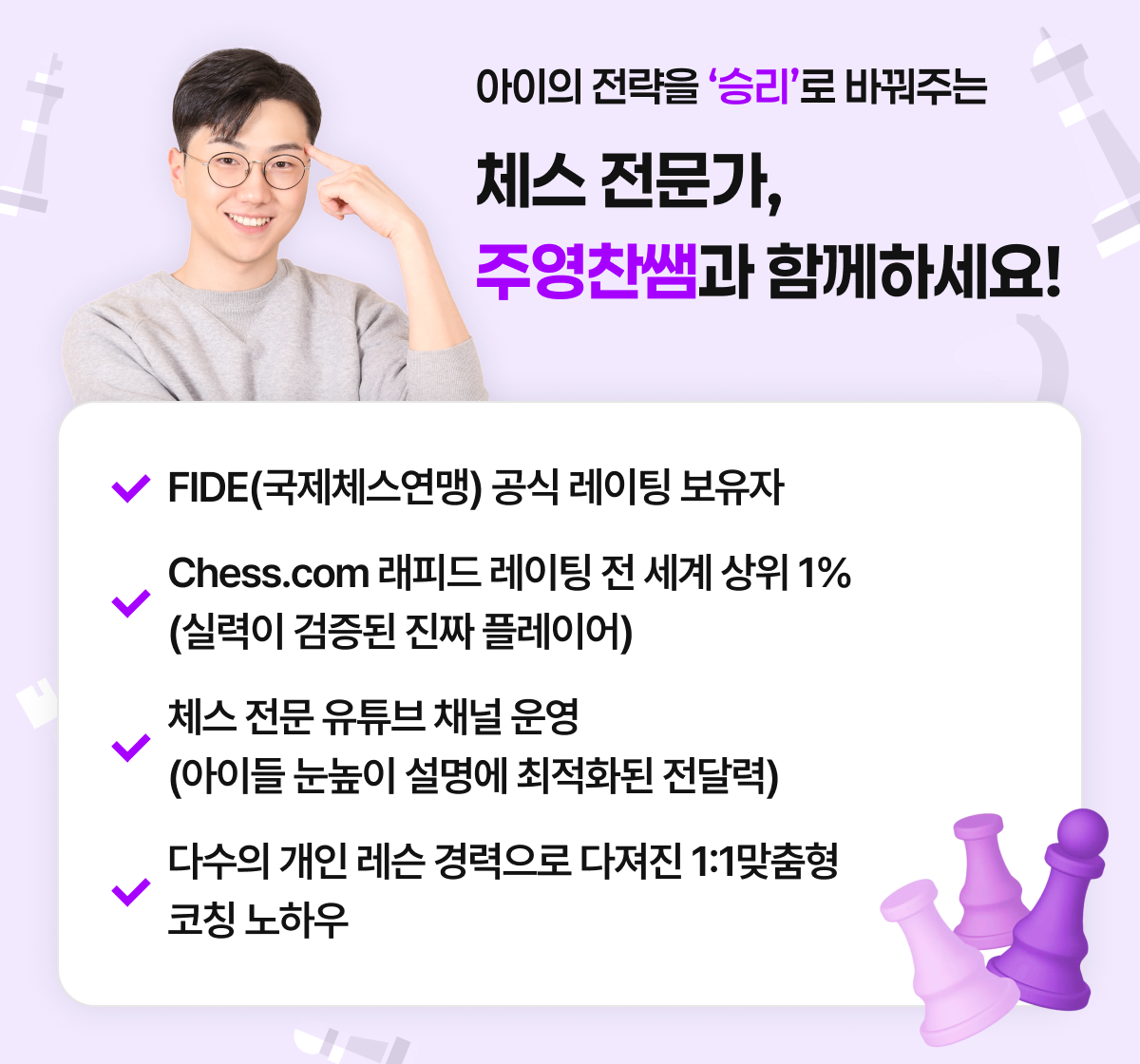 안녕하세요! 체스를 가르치고 있는 영찬쌤입니다. 아직도 체스를 그저 즐기기만 하는 게임으로 알고 있나요? 어떤 수를 선택해야 하는지, 내가 유리해지려면 어떻게 계획을 세워야 하는지, 포지션 평가, 전술적인 사고방식 등 모두 논리적인 근거가 있답니다. 영찬쌤과 함께 체스를 배우고 멋지게 체크메이트 시켜보자구요~!