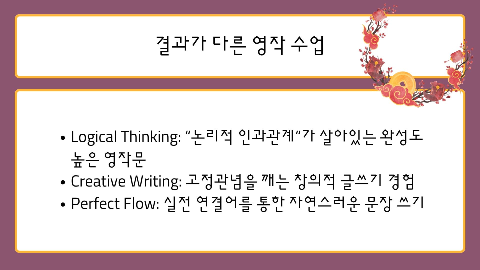 단순 문장 나열이 아닌 *'논리적 인과관계'*가 살아있는 영작문 완성.