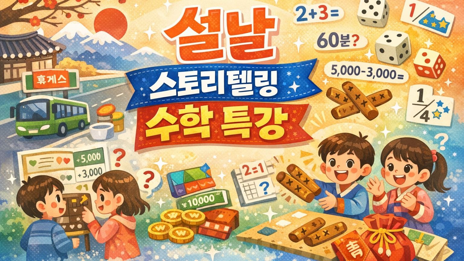 설날 속 익숙한 장면을 바탕으로 이동 시간, 예산 계산, 윷놀이 확률 등 교과서에 나오는 계산 개념을 생활 상황에 적용해보는 체험형 수학 특강입니다. 짧지만 차분하게 계산의 의미를 이해하도록 구성했습니다.