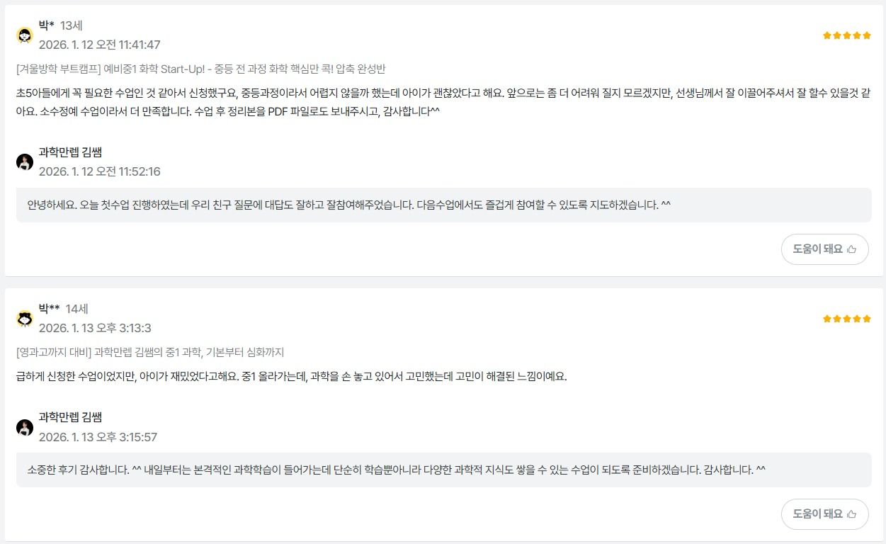 🎓 믿고 맡기는 과학 선생님! ‘과학만렙 김쌤’ 입니다 안녕하세요, 과학 교육 경력 15년 이상! 전자공학, 물리를 전공하고 영재교육 석사를 졸업, 아이들 교육을 고민하며 교육학 박사과정을 진행하면서 학생 눈높이에 맞춘 과학 수업을 진행하는 과학만렙 김쌤입니다. 🧠 어려운 과학? NO! 기초부터 탄탄히, 내신은 물론 심화 개념까지 완벽하게! 아이들이 과학을 ‘이해’하고 ‘재미있게’ 느낄 수 있도록 만드는 수업, 그것이 바로 과학만렙 온라인 클래스입니다. 🚀 왜 김쌤의 수업이어야 할까요? • 기초부터 심화, 입시까지 완벽 마스터 어려운 개념도 쉽게! 내신 성적 향상은 기본이며, 영재고·과학고·특목고 대비를 위한 심화 개념까지 빈틈없이 지도합니다. • 맞춤형 진로 & 학습 코칭 아이의 성향을 분석하는 진로적성상담과 스스로 공부하는 힘을 기르는 자기주도학습 가이드를 통해 과학 점수 그 이상의 '공부 자신감'을 심어줍니다. • 융합형 인재 양성: 아낌없는 지원과 미래 교육에 대한 깊은 이해를 바탕으로, 인공지능지도사 1급 및 ChatGPT 융합교육지도사 자격증을 취득하여 미래 사회가 요구하는 융합 영재 교육을 선도합니다. • 검증된 교육 콘텐츠 전문가: 다수의 교육 콘텐츠 개발 및 저술 경험(로블록스, 사이언스데이, 코딩랩 영재과학 시리즈 등)을 통해 아이들의 흥미를 자극하고 학습 효과를 극대화하는 맞춤형 콘텐츠를 제공합니다. 🎓부산영재고, 용인외고, 상산고 등 다수 지도 하였습니다. 🎓수행평가, 내신대비는 과학만렙 김쌤과 함께 해보세요! 📝 학부모님께 드리는 약속: 믿고 맡겨주시면, 우리 아이가 과학에 흥미를 느끼고 스스로 깨우치는 즐거움을 통해 성적 향상과 더불어 미래를 준비하는 힘을 길러주겠습니다. 수행평가, 내신 대비도 과학 만렙 김쌤과 함께하세요!